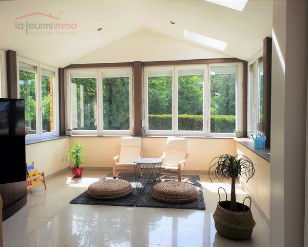 Située dans un environnement, calme et verdoyant, elle se compose d'un sas d'entrée, d'un dégagement, d'une cuisine équipée avec îlot central et bar, d'une salle à manger avec cheminée et d'une belle salle de bain équipée avec toilette, baignoire d'angle et douche. La véranda, rajoutée en 2003, permet d'accueillir une belle pièce de vie de 22 m², très lumineuse, avec ses nombreuses fenêtres.