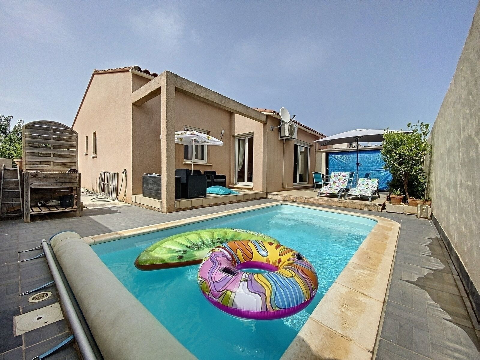 La piscine en 5m par 2,5m est traitée au chlore, filtré aux cristaux et... la surprise ! Chauffée !