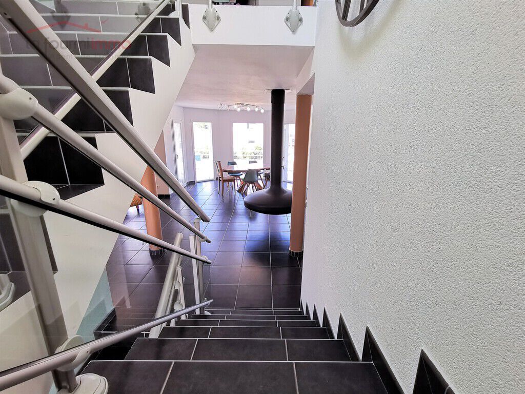 Grand salon salle à manger avec une magnifique cheminée suspendue style goutte d'eau