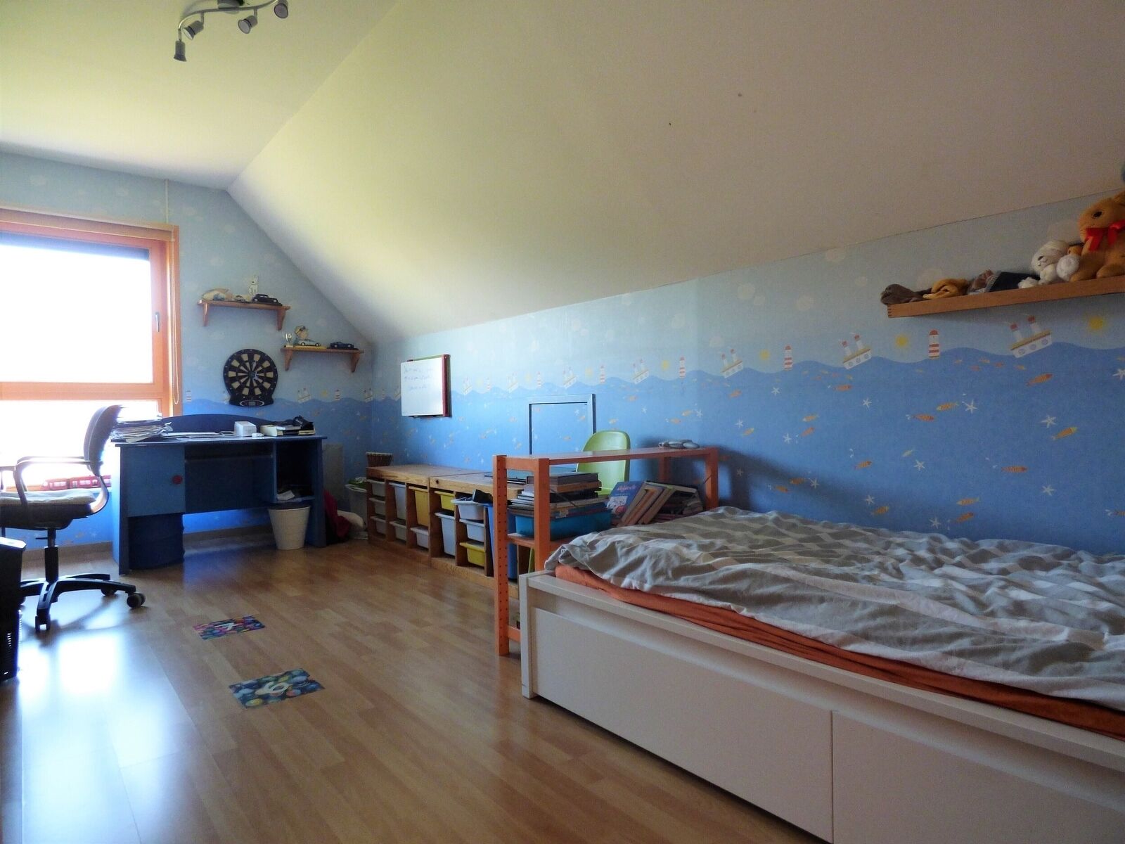 À l'étage, le hall de nuit distribue une chambre avec dressing de 22m², 2 chambres de 18m² avec penderie et d'une salle de bains avec baignoire, douche et toilettes.