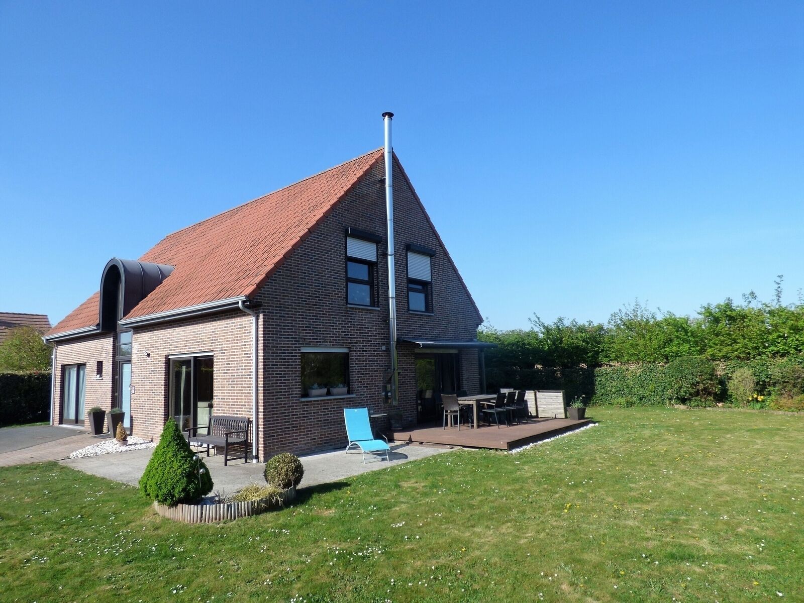 À l'extérieur le jardin arborée et sa terrasse en bois exposée plein sud vous invitent à profiter des journées en famille et des soirées entre amis.