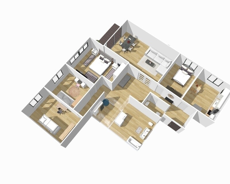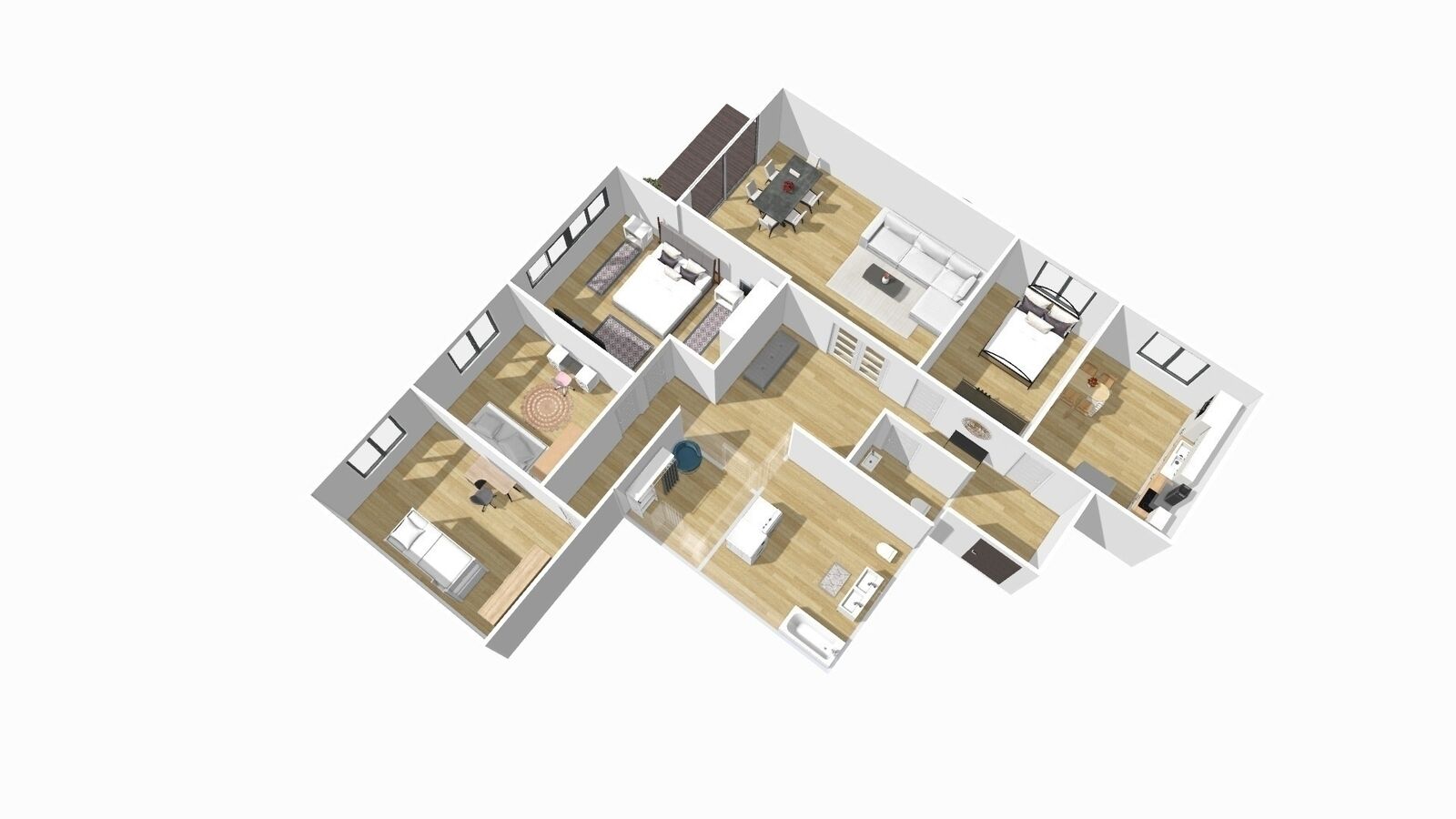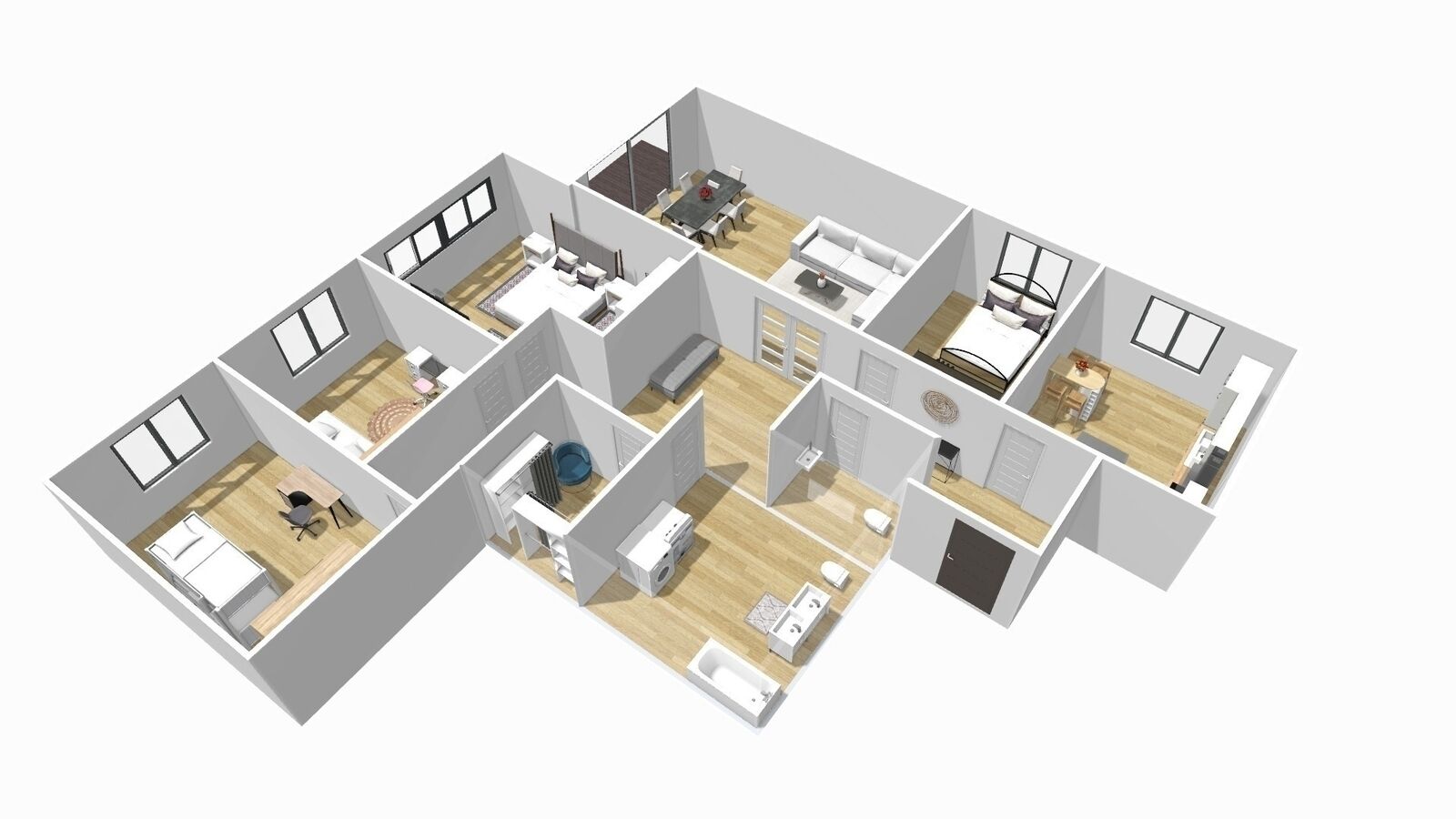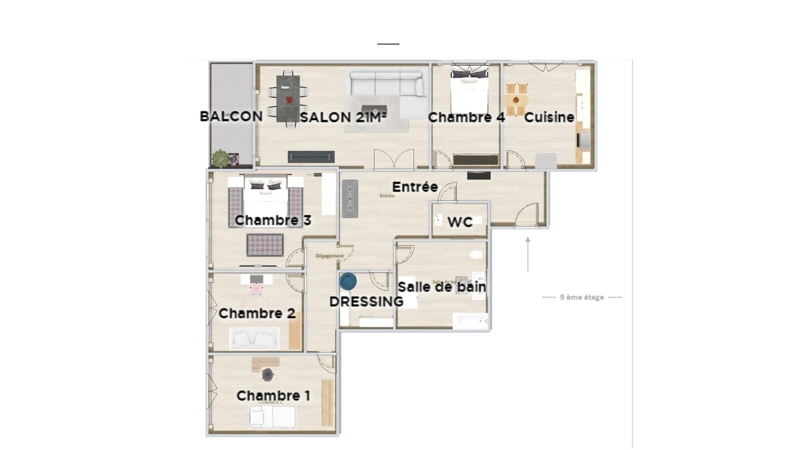 Une entrée dessert un Salon/salle à manger avec accès balcon de 6 m2 exposé Ouest, une Cuisine séparée, 4 Chambres, un Dressing, une Salle de bains avec WC + un WC séparé.