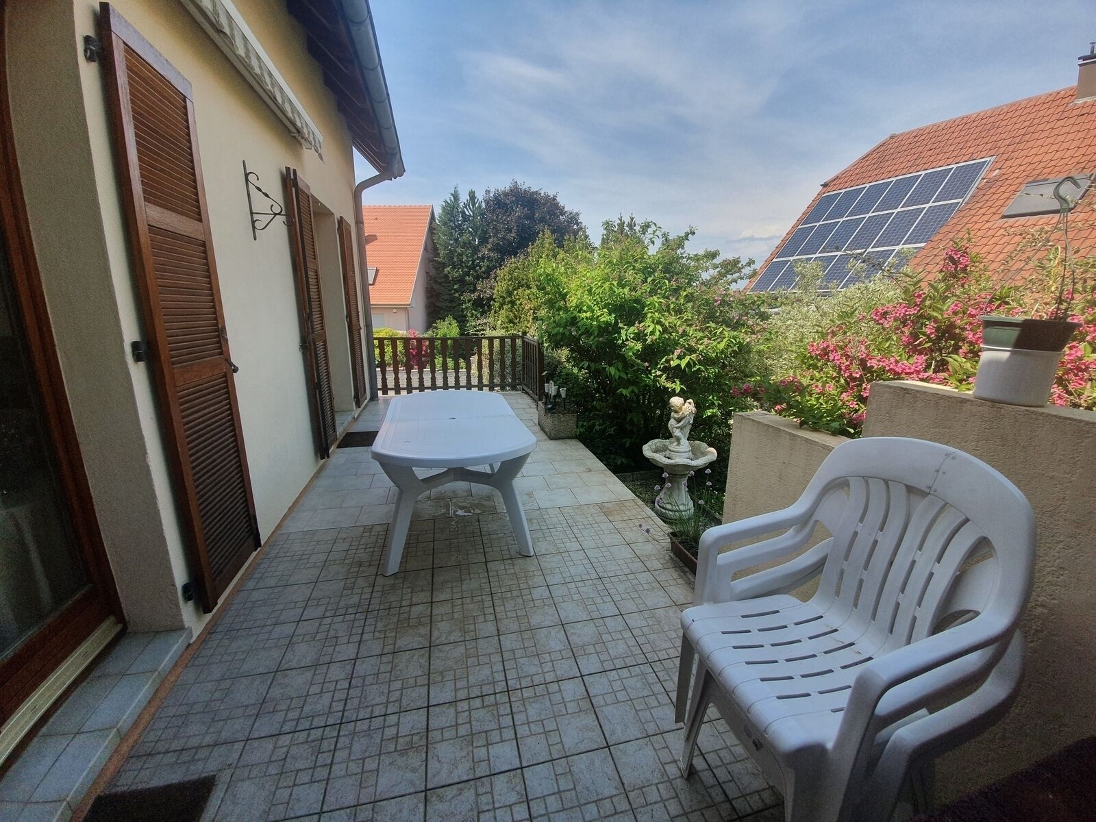 à l'extérieur: une belle terrasse d'environ 15 m2, un beau jardin et plusieurs places de parking.