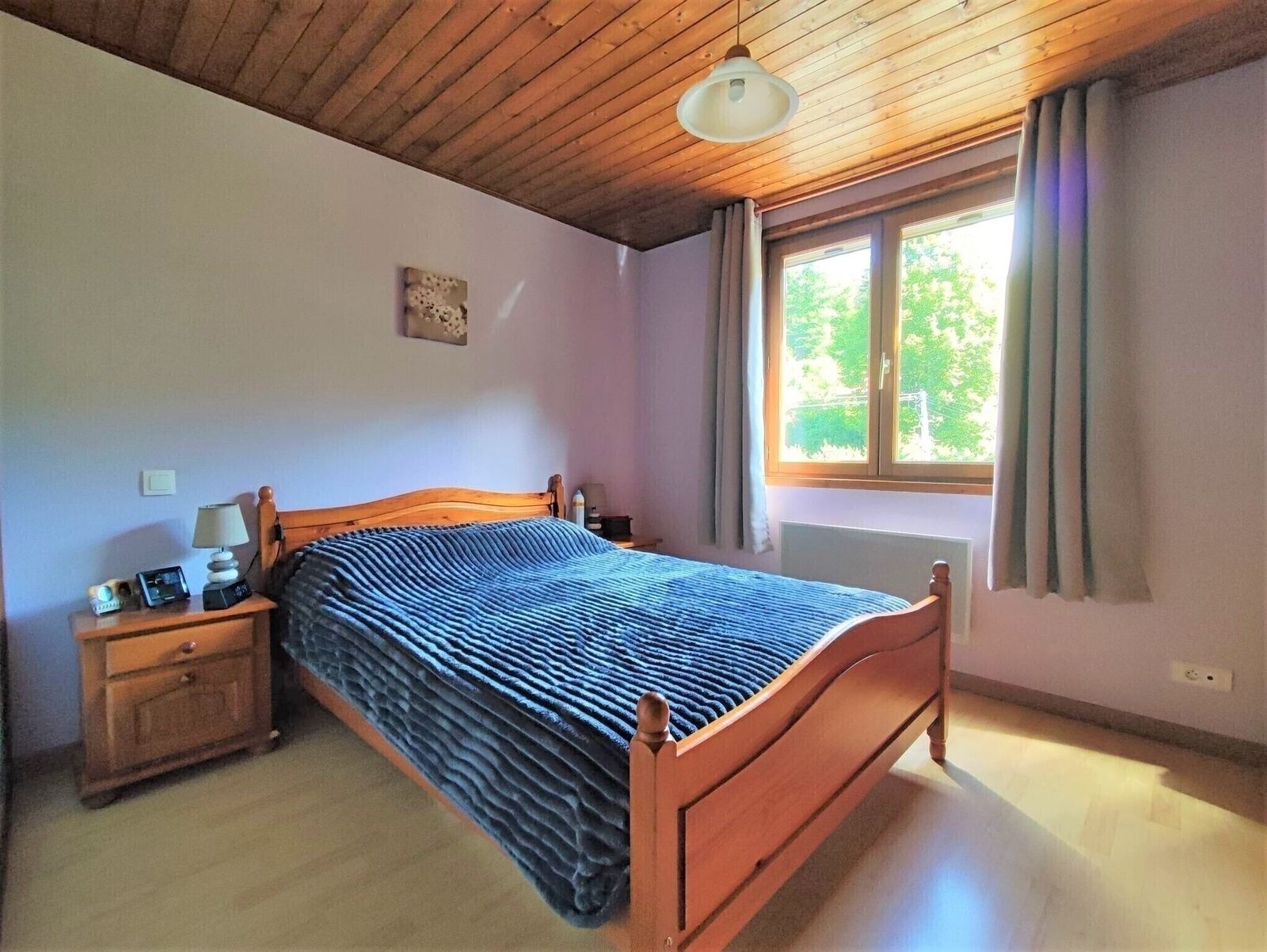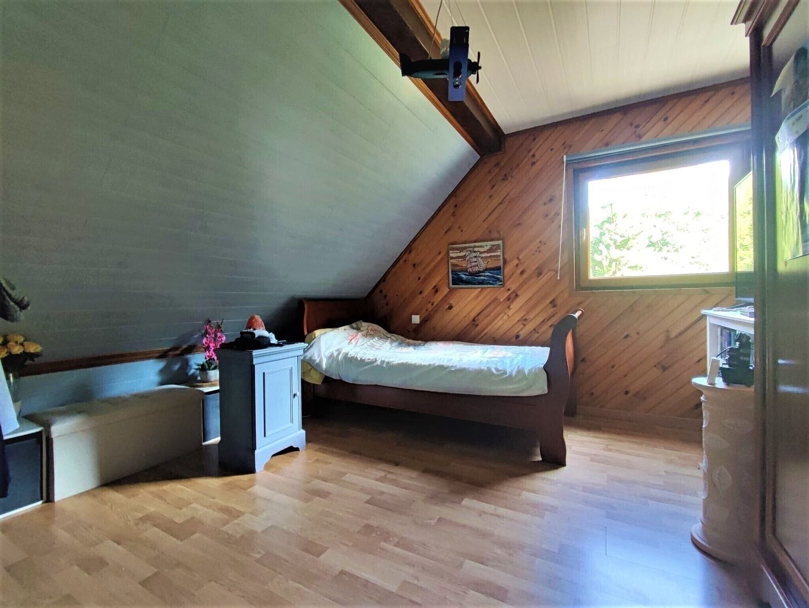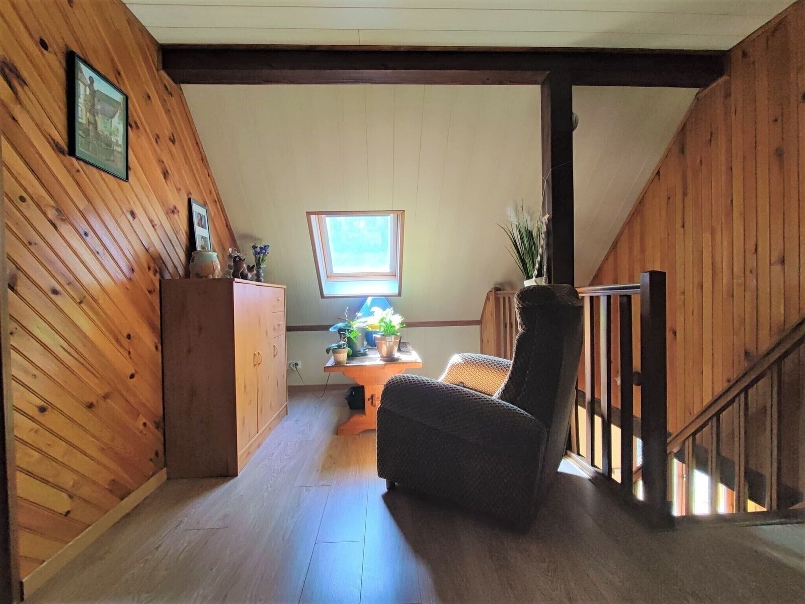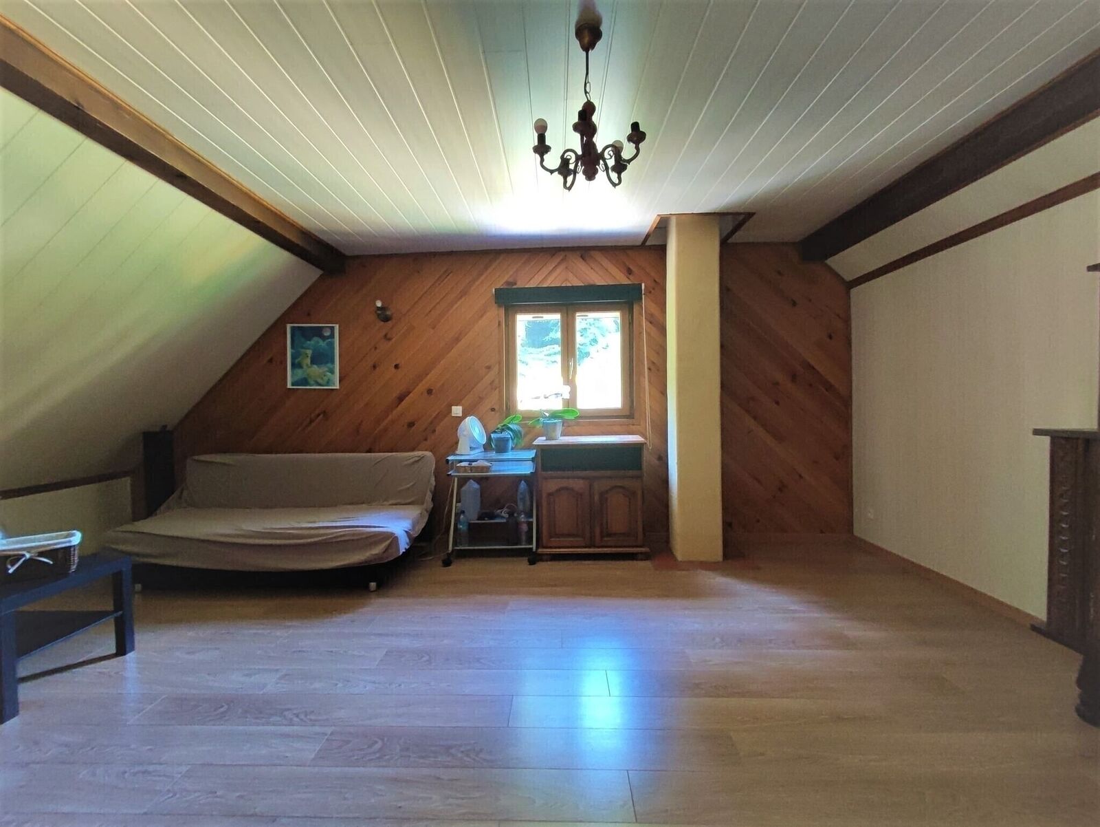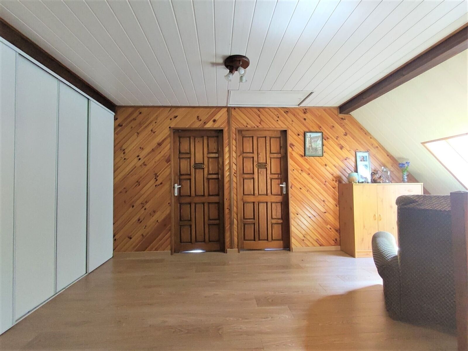 - A l'étage: Un grand séjour d'environ 38 m2 au sol avec une armoire murale intégrée et deux chambres.