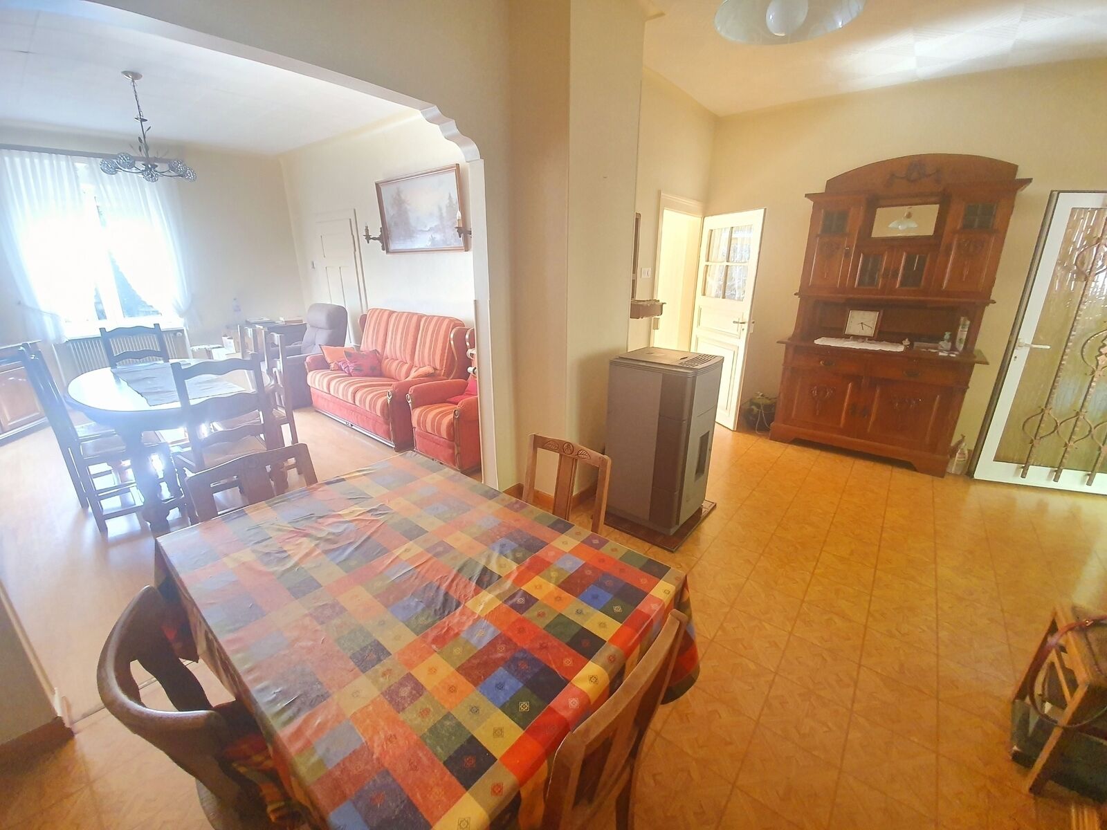 au rdc: une entrée de 5.90 m2, une salle à manger équipée d'un poêle à granules de 17.50 m2 ouverte sur un salon de 19 m2, une cuisine équipée de 4.90 m2, une salle d'eau refaite à neuf de 5.80 m2, un wc de 1.40 m2, un sas de 1.30 m2, un cellier de 5.5 m2, une chambre de 12.25 m2 et une chambre de 19.35 m2.