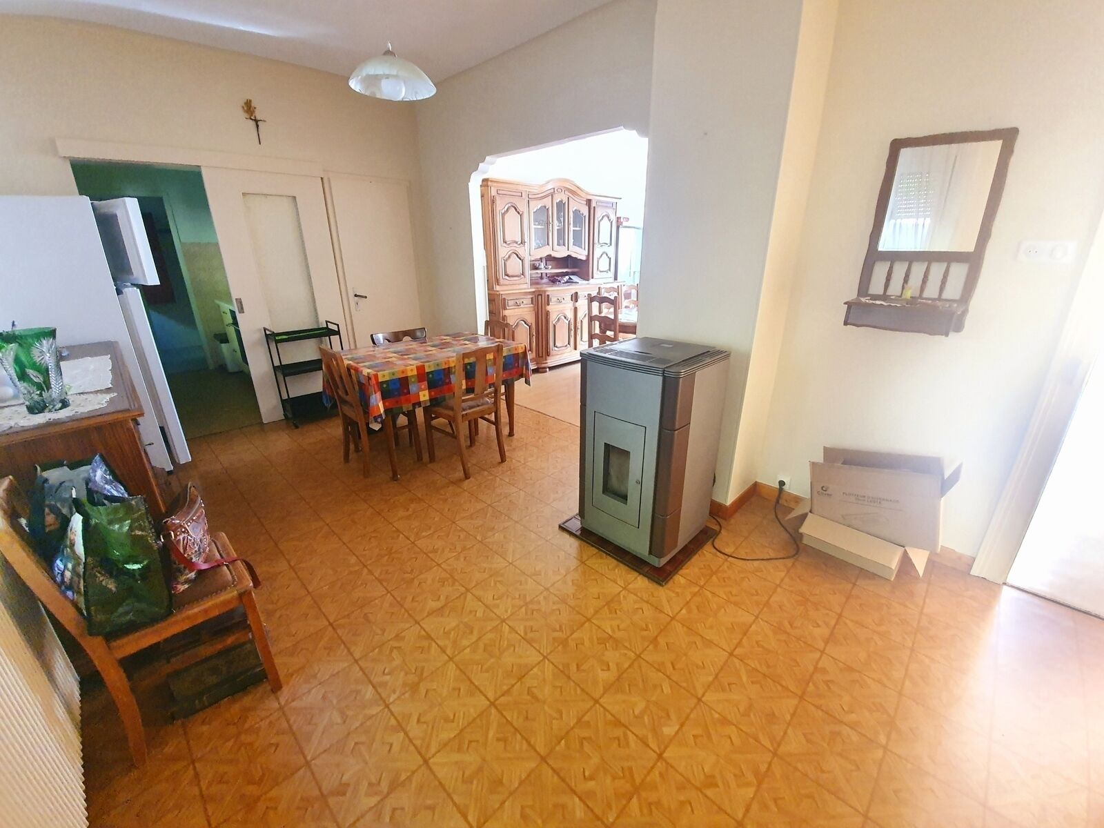 La maison est équipée d'une chaudière au fioul, de fenêtres double vitrage en pvc et d'un poêle à granules.