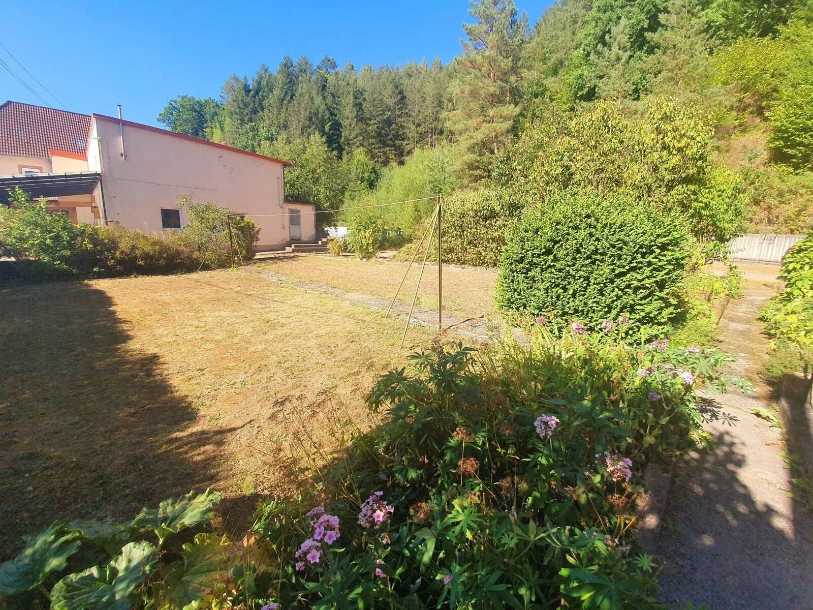 à l'extérieur: un grand terrain comprenant un jardin, une partie forêt et plusieurs places de parking.