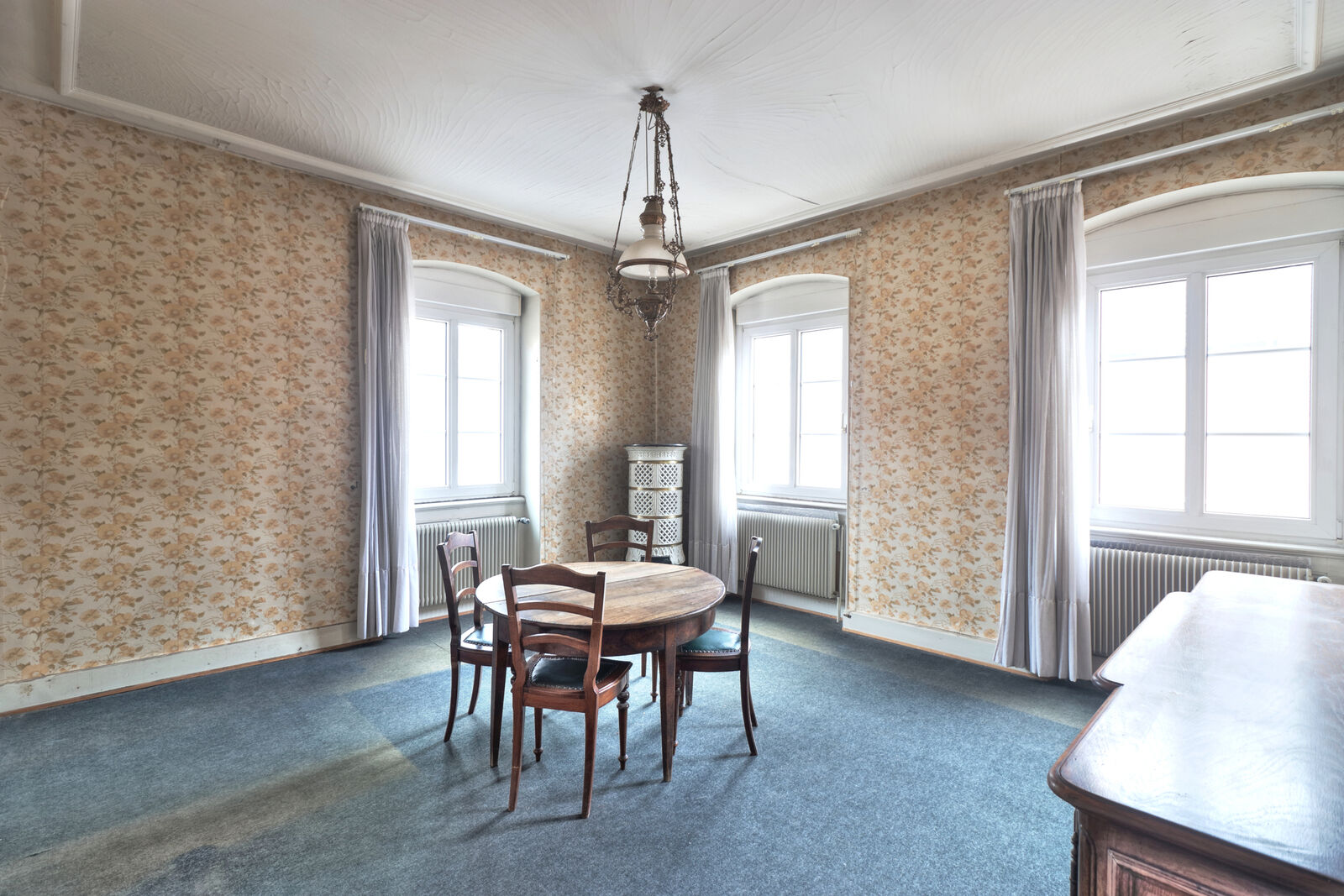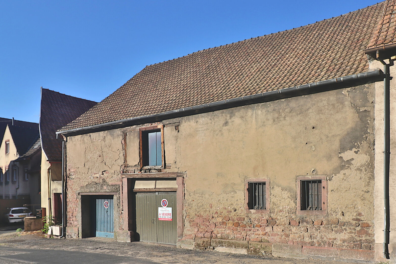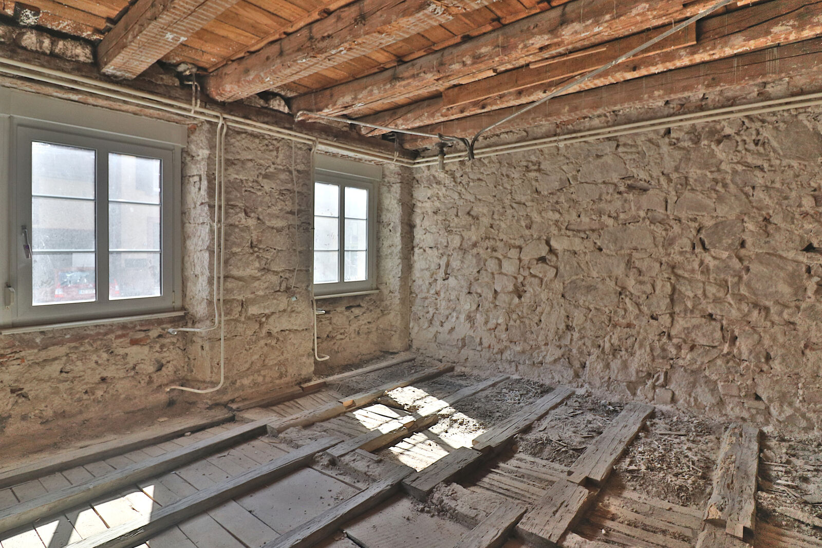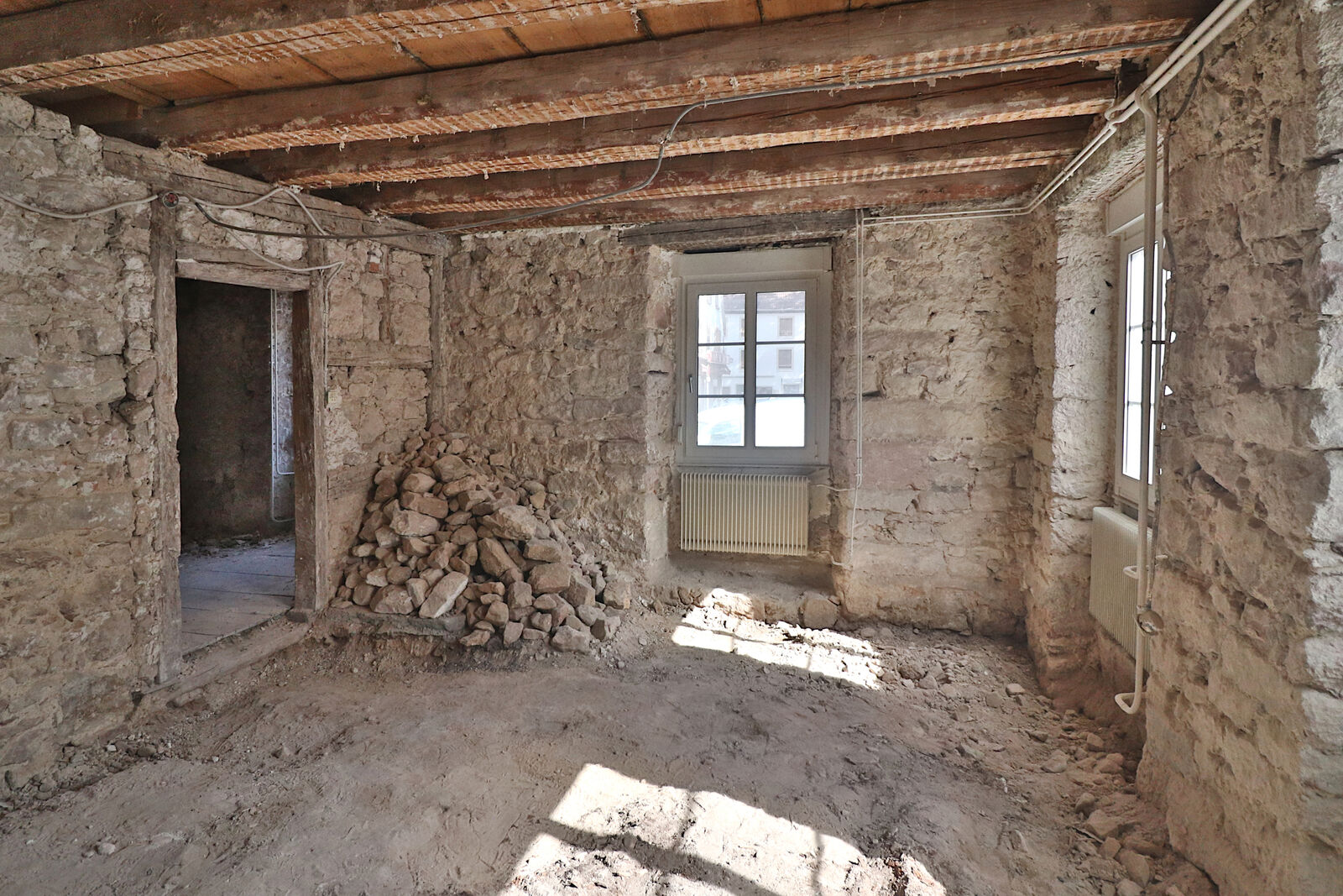 - Au rez-de-chaussée, qui a été intégralement mis à nue, laissant ainsi apparaître les murs d’origine en grès rose, une surface habitable de 95,80 m² avec 3 pièces principales, partiellement ouvertes. De gros travaux y sont encore à prévoir.