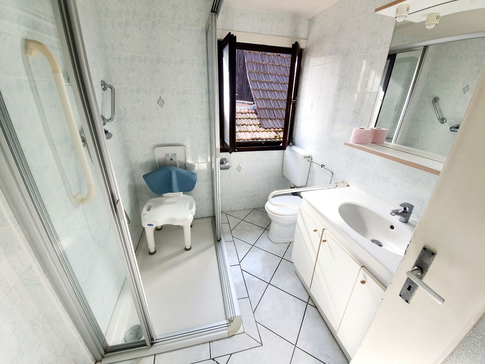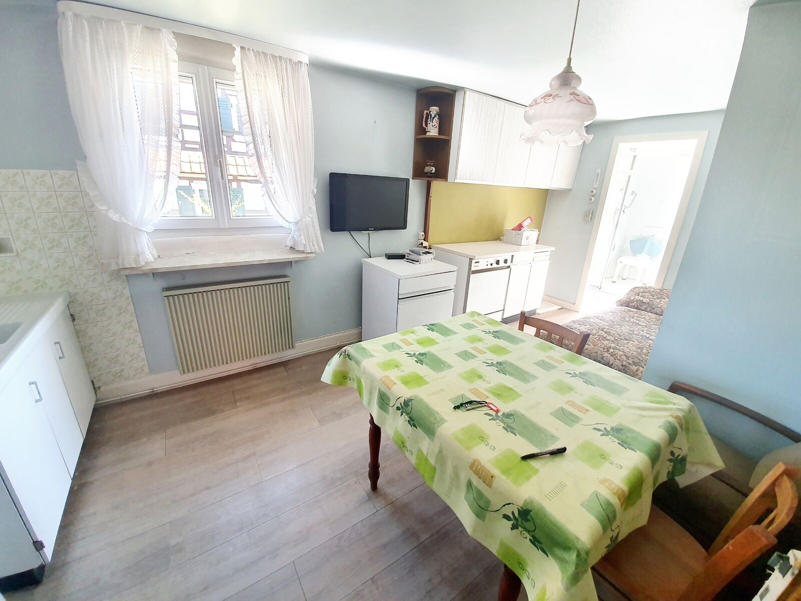 au rdc: une entrée, un grand salon-séjour, une cuisine, une chambre et une salle d'eau avec douche et wc.