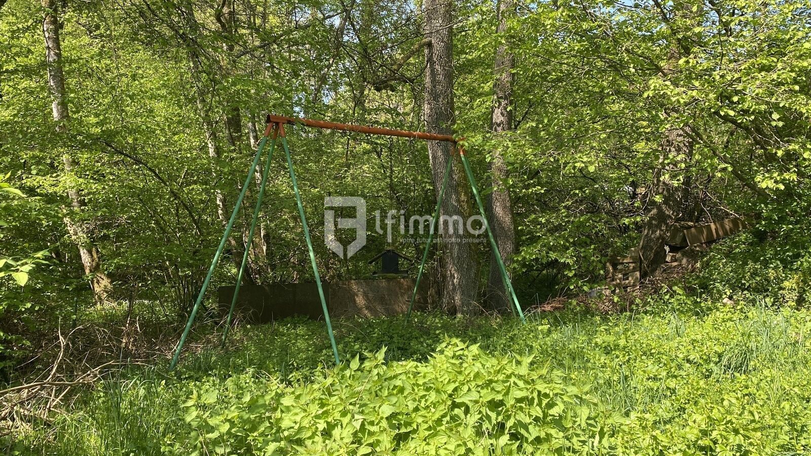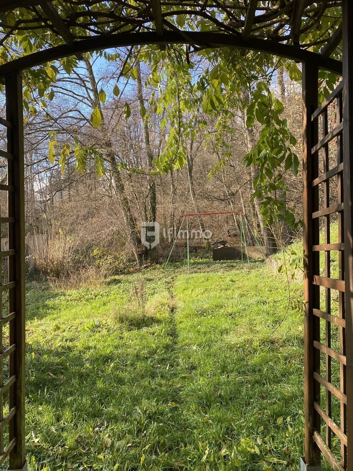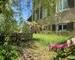 Le jardin de la maison est entouré de grands arbres et clôturé.