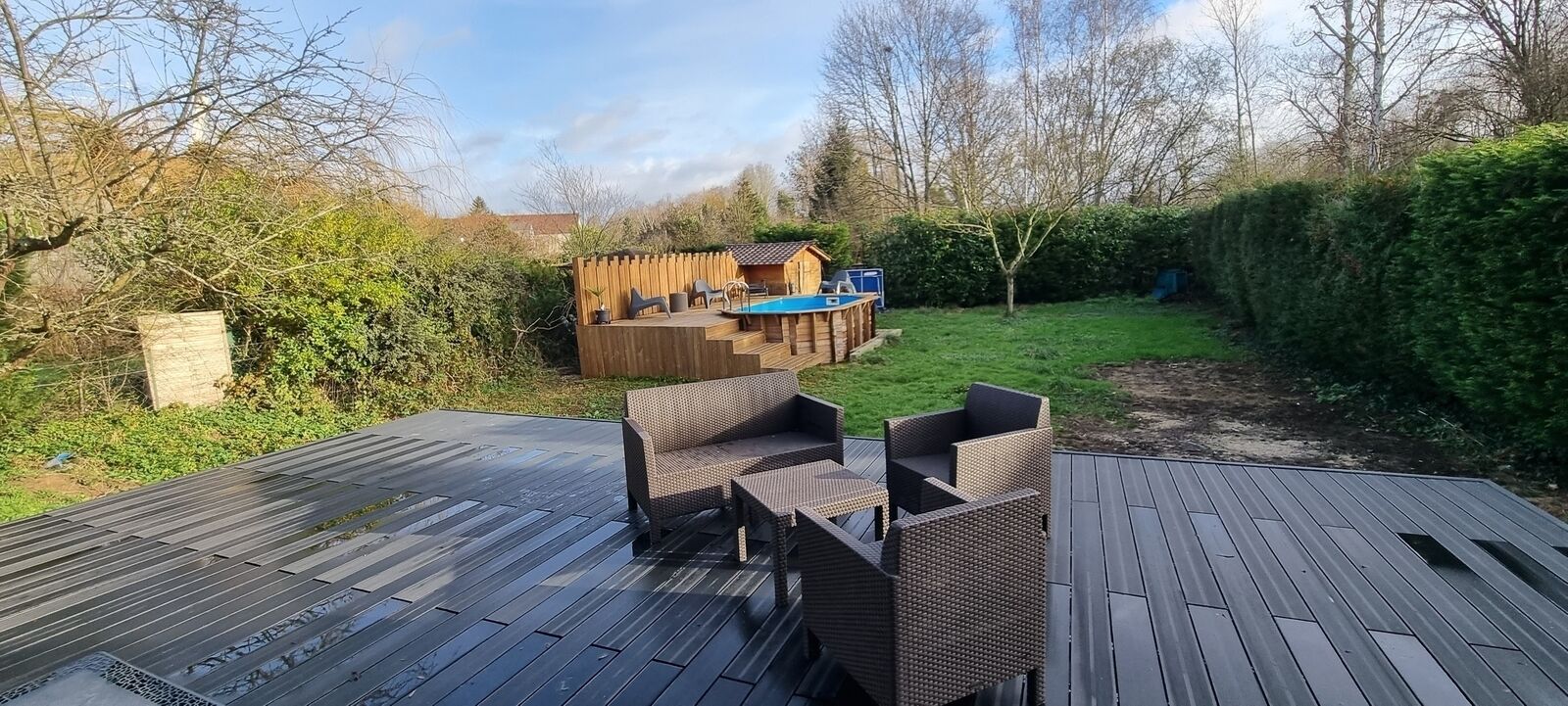 Le jardin est l'un des atouts majeurs de cette maison avec ses sublimes terrasses en composite, une piscine et un abri bois. Le terrain est clôturé et ne dispose d'aucun vis-à-vis avec un bois à l'arrière. De plus, la maison dispose d'un garage attenant avec une pièce au-dessus avec un espace de stockage, ainsi qu'une buanderie.
