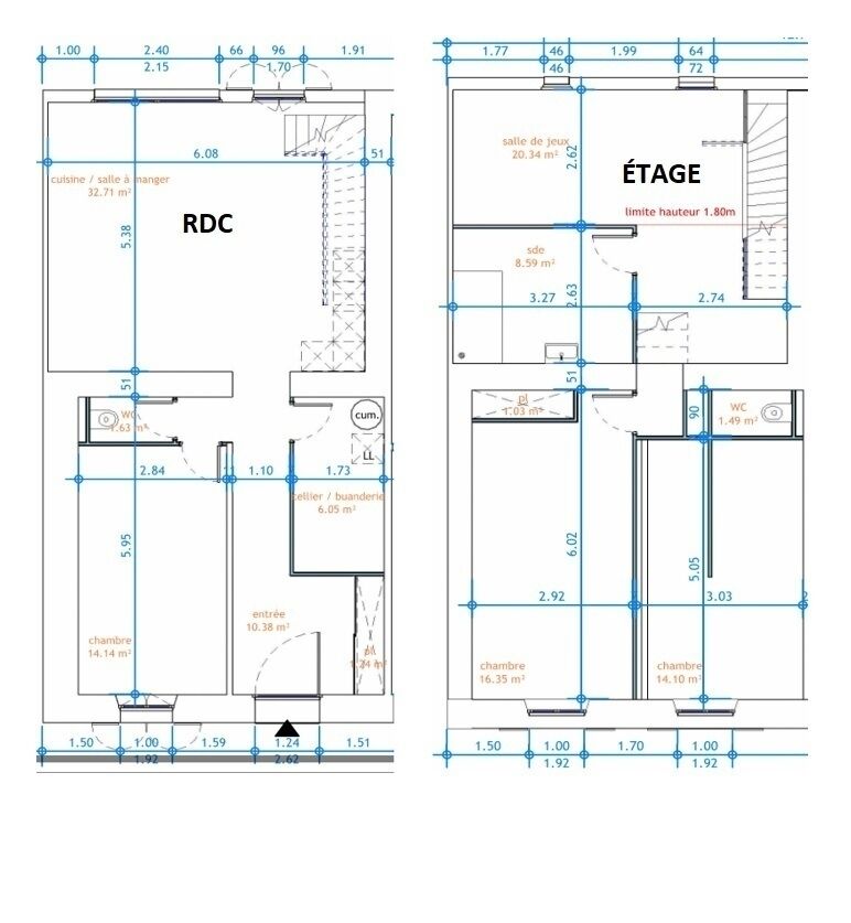 A l'étage : 2 grandes chambres, une salle de jeu de 20m2, une salle d'eau et des WC