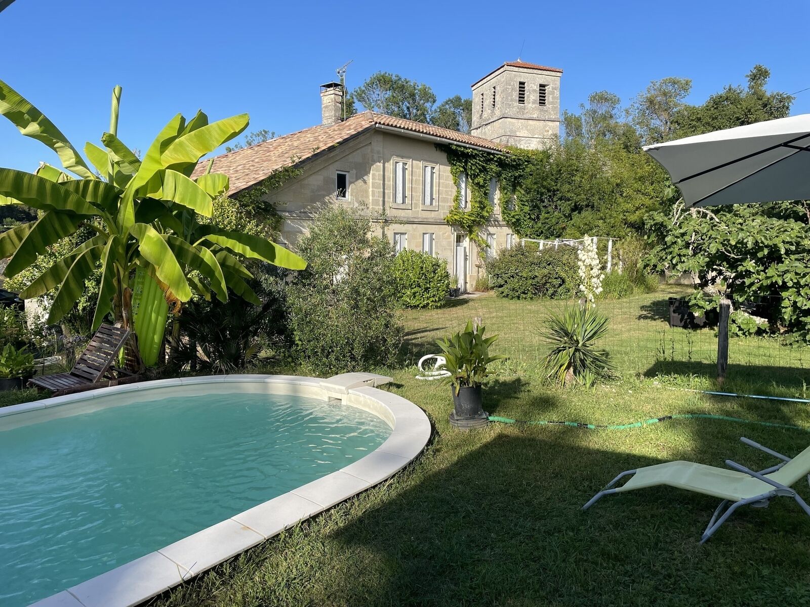 Maison girondine rénovée, construite fin XIXe siècle qui a conservé murs et cheminées en pierre, carreaux de terre cuite d'origine pour l'entrée, le salon et la cuisine, planchers vrai bois à l'étage mais avec le confort d'une climatisation réversible, isolation et doubles vitrages d'où son DPE en C -datant de janvier 2025-, bénéficiant d'une piscine de 7,5 x 3,5 m sur 1705 m2