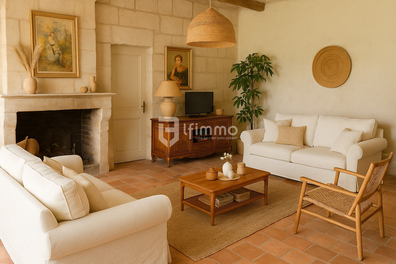 -salon de 35 m2 avec cheminée distribuant les 2 suites, cuisine équipée de 24 m2,