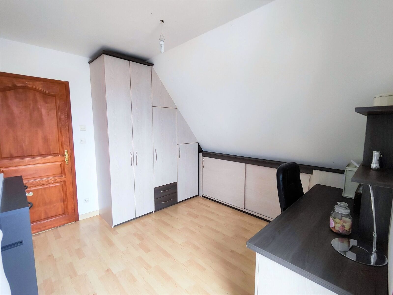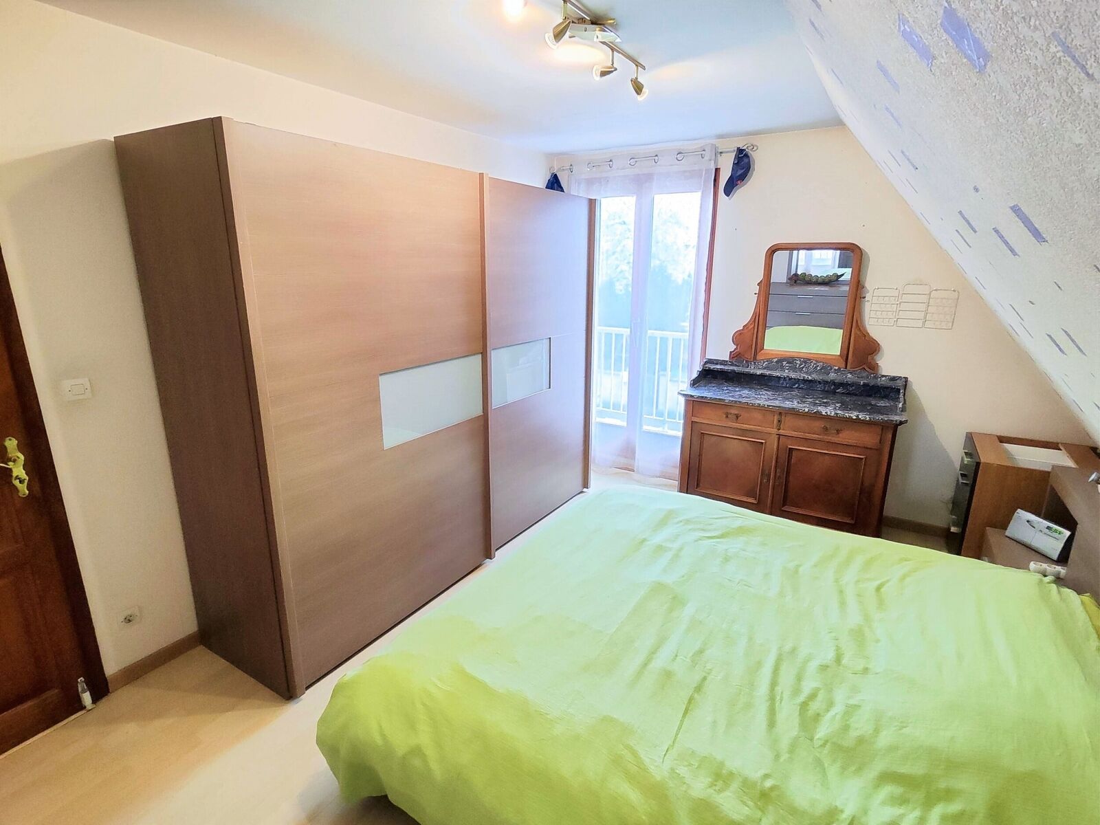 À l'étage, un couloir dessert trois chambres, dont une bénéficie de placards muraux sur mesure, tandis que les deux autres offrent un accès direct à un balcon. Une salle de bain avec WC complète ce premier étage, répondant ainsi aux besoins de toute la famille.