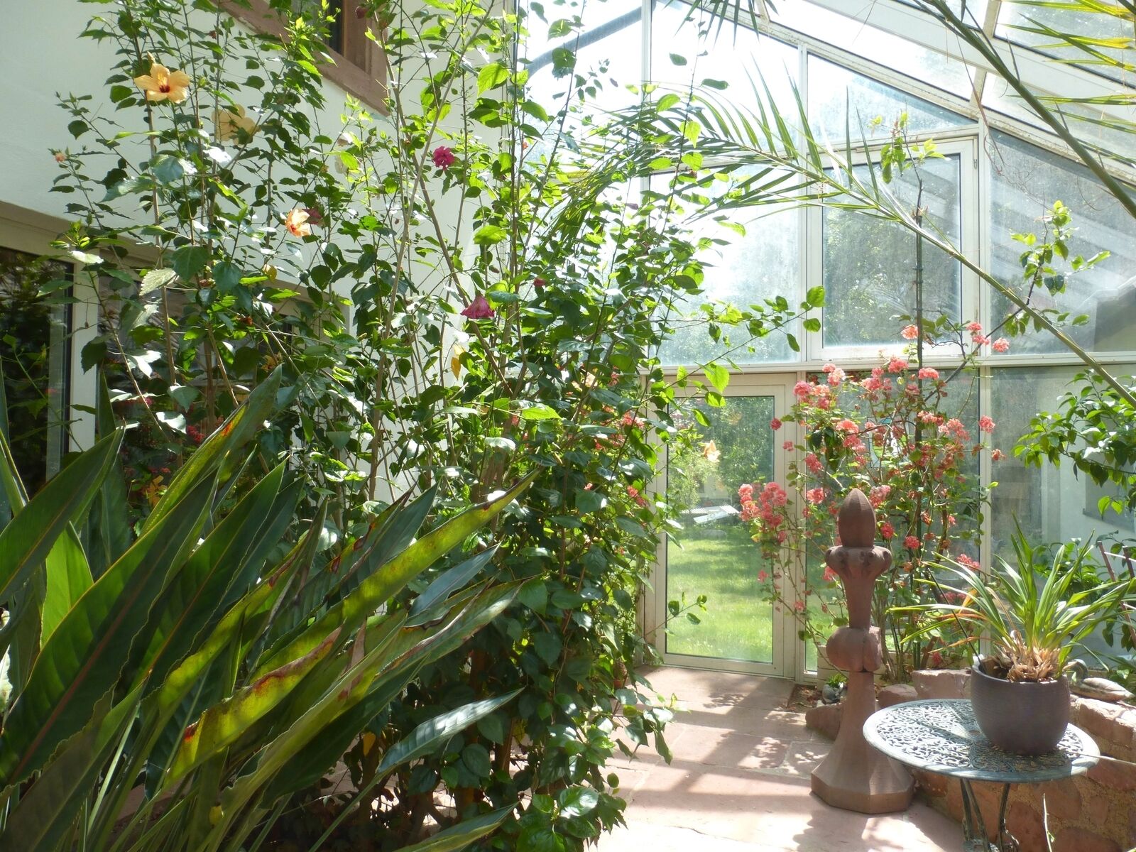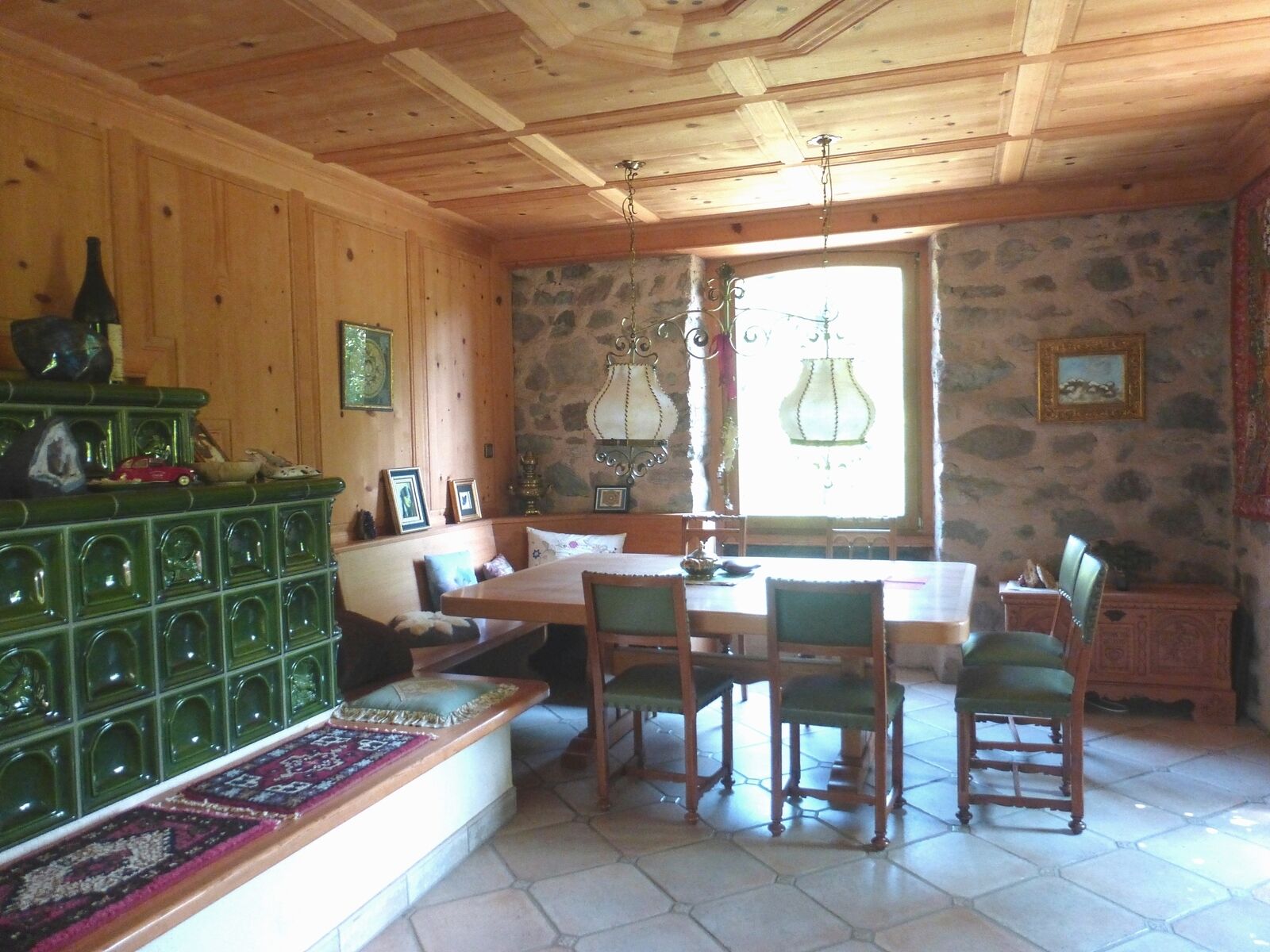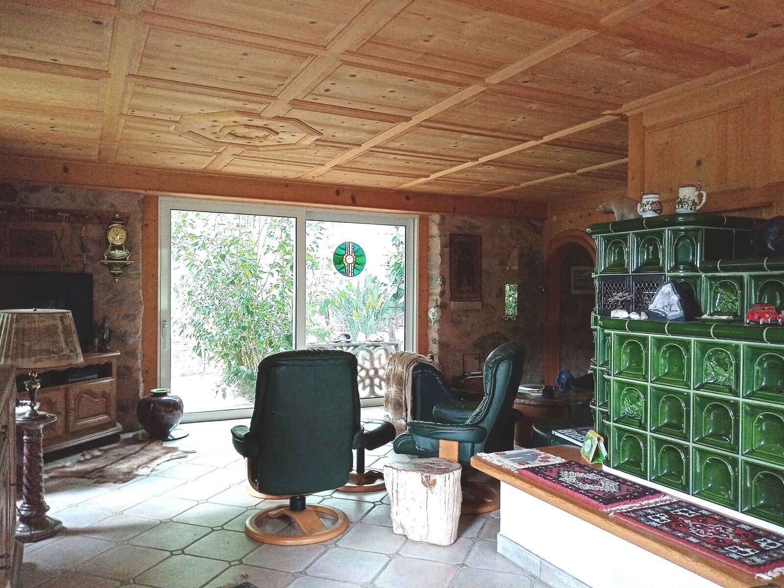 Im Erdgeschoss: zwei geräumige Eingänge, eine Küche, Toiletten und ein großes Wohnzimmer, das um einen Kachelofen angeordnet ist und sich zur Veranda und dem Wintergarten öffnet.