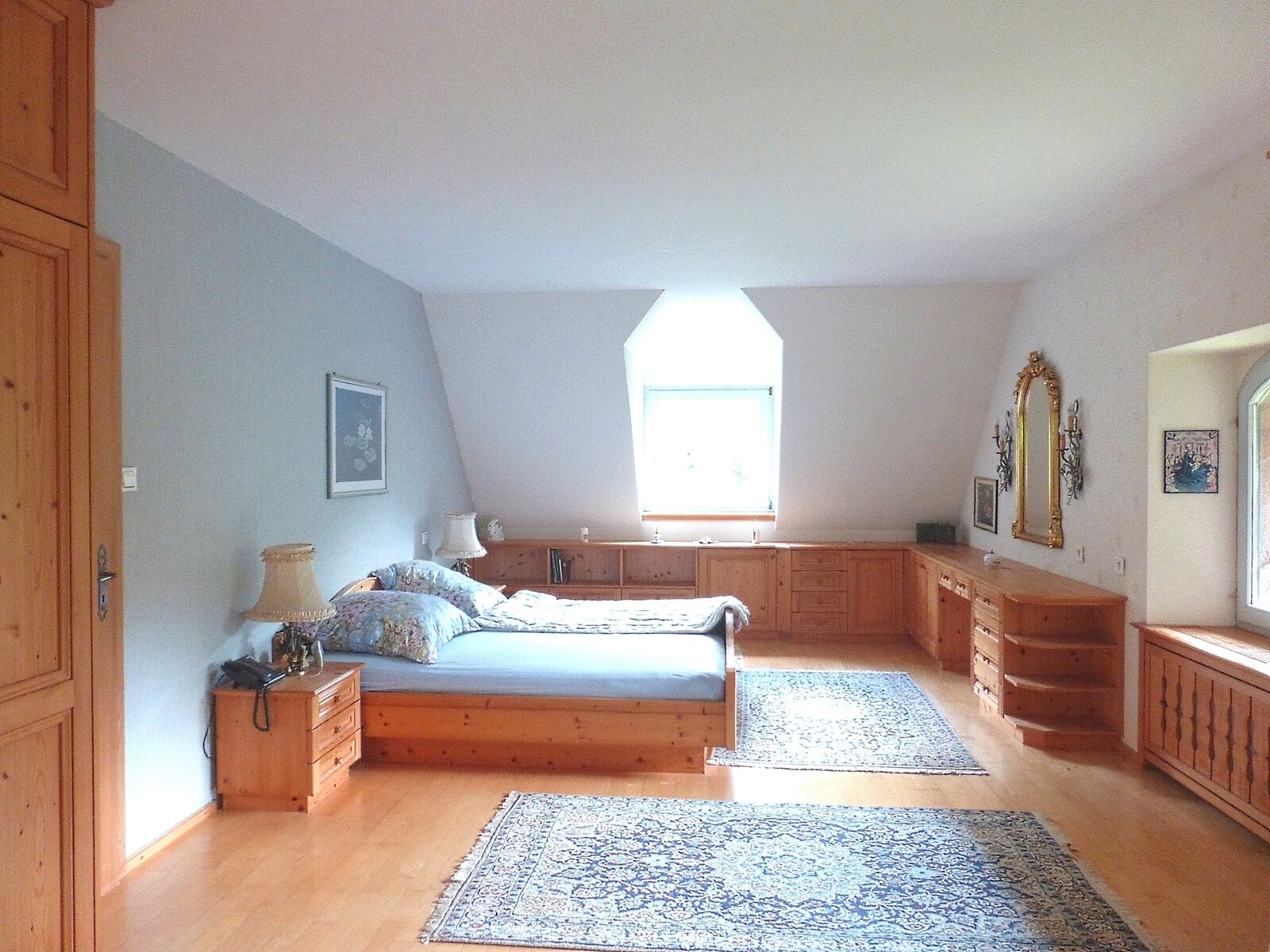 Im 2. Stock: Ein großes Hauptschlafzimmer mit begehbarem Kleiderschrank, ein geräumiges Badezimmer mit Saunabereich, ein Flur und ein Schlafzimmer.