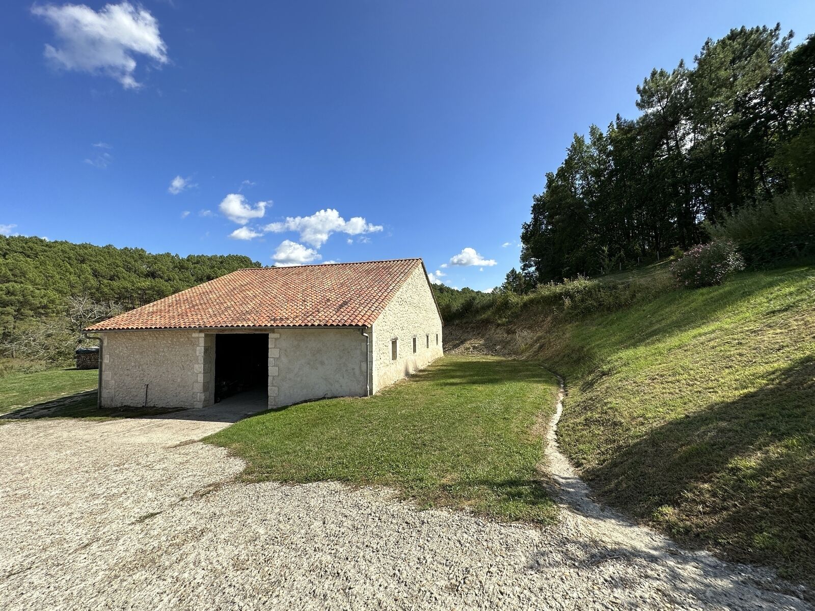 une piscine, une source et une grange.