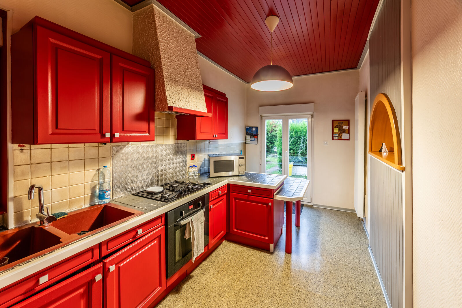 Un accès extérieur est possible, directement de la cuisine ou par le côté de la bâtisse, vers une terrasse et un ancien potager.