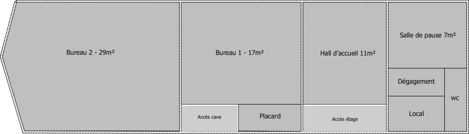 Au rez-de-chaussée d'un hall d'accueil de 11m², de 2 bureaux de 17m² et 29m² et d'une salle de pause aménagée de 7m² disponible pour vos collaborateurs.