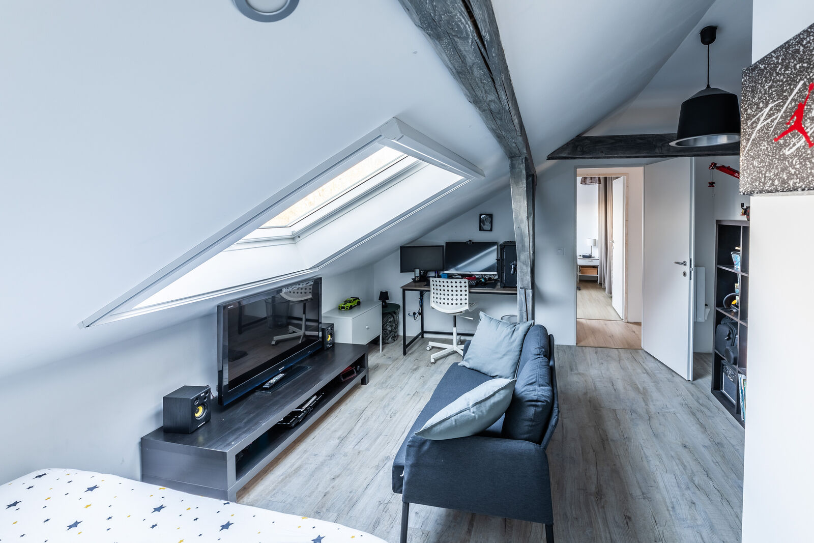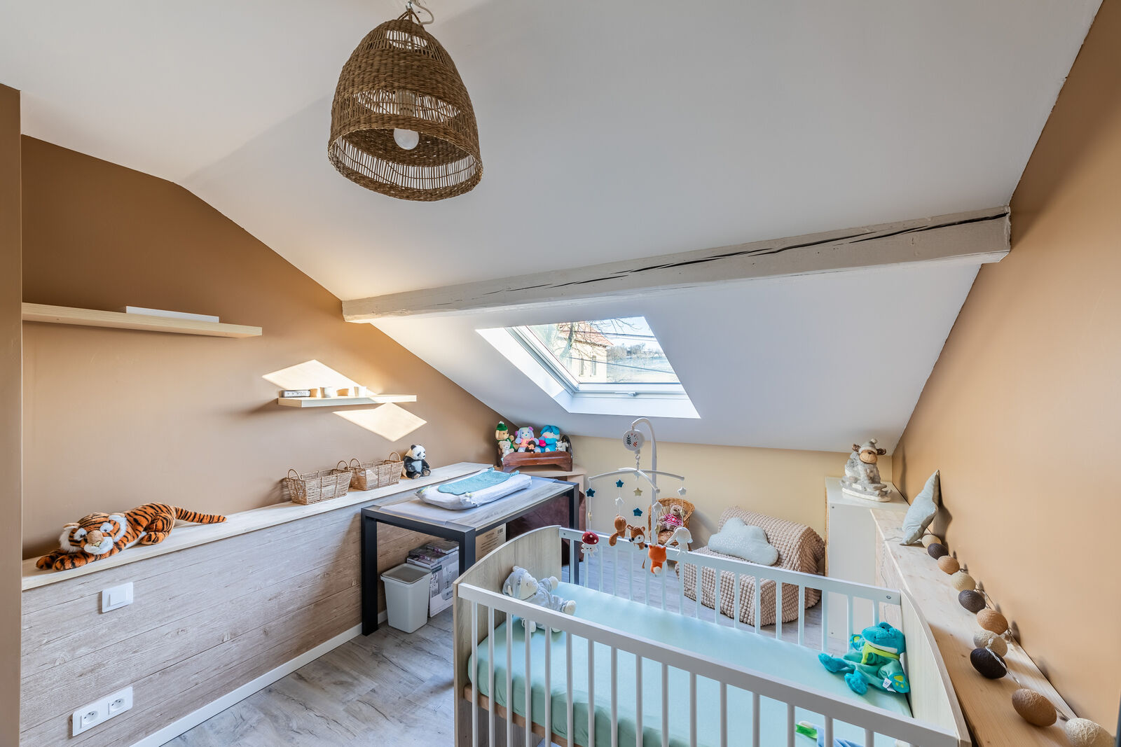 Présence d'un R+1, où nous y voyons exclusivement la « partie nuit » avec la découverte de principalement 3 chambres (Une Quatrième pièce, Pouvant être qualifiée comme une Chambre d’enfant, ou un Bureau, est également présente).