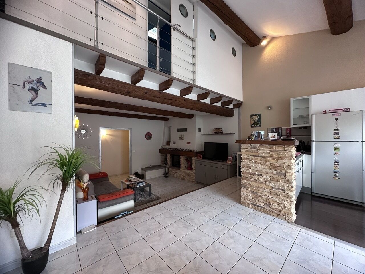 L'étage révèle une grande pièce de vie lumineuse, avec un salon cosy doté d'une cheminée pour réchauffer vos soirées, et une cuisine entièrement équipée pour ravir vos talents culinaires.