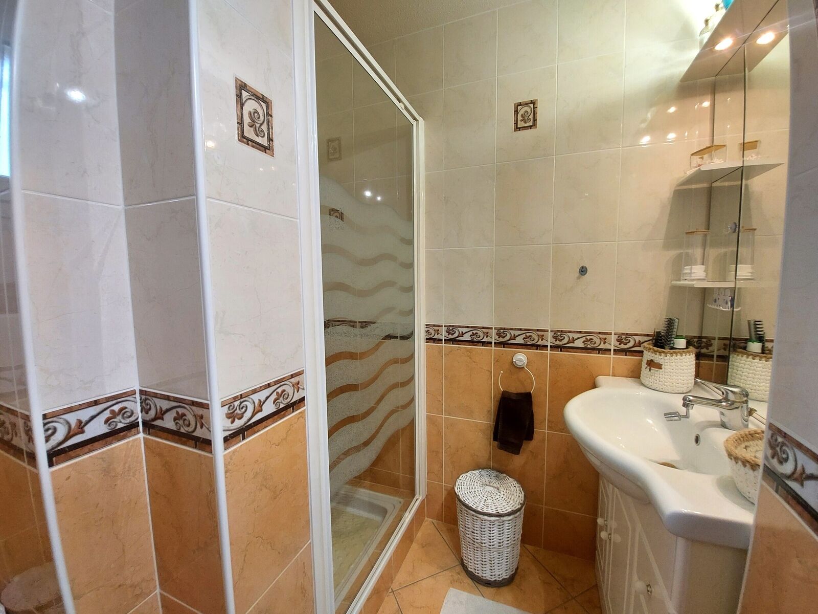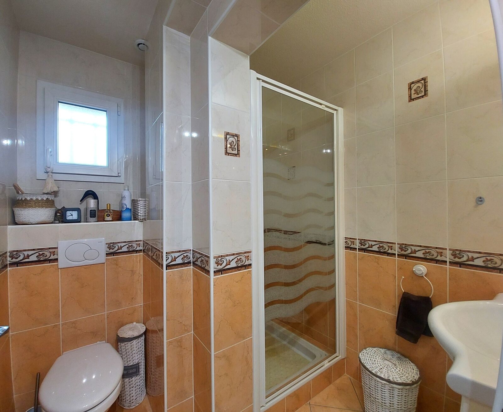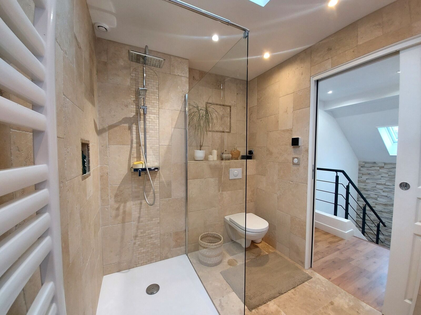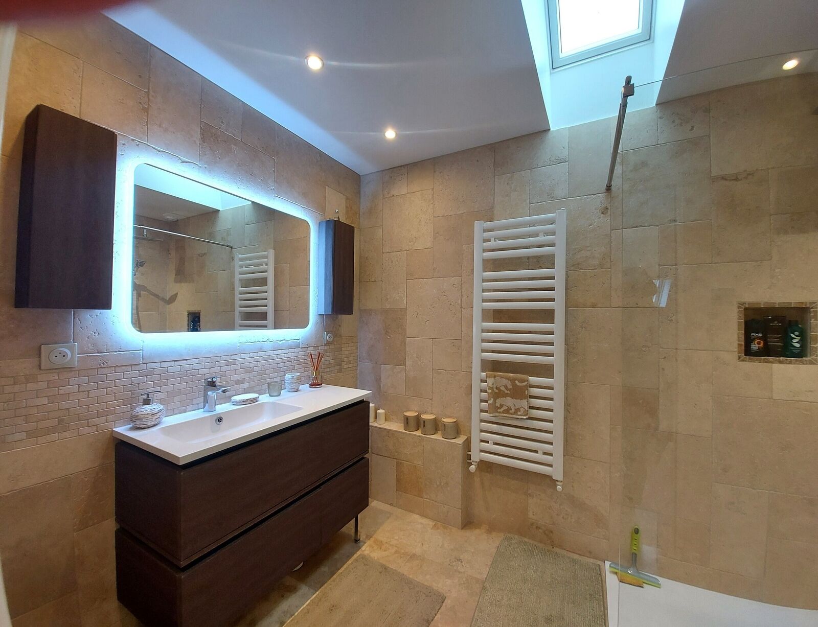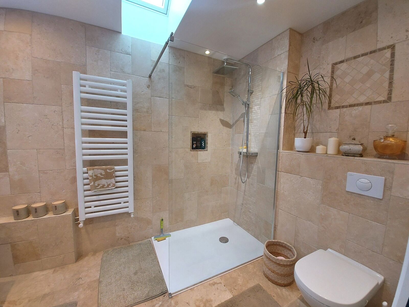 Le premier étage est tout aussi accueillant avec un bel escalier moderne vous menant à un palier desservant deux belles chambres équipées chacune de placards et une magnifique salle de bain WC en pierre de travertin très joliment décorée avec goût.