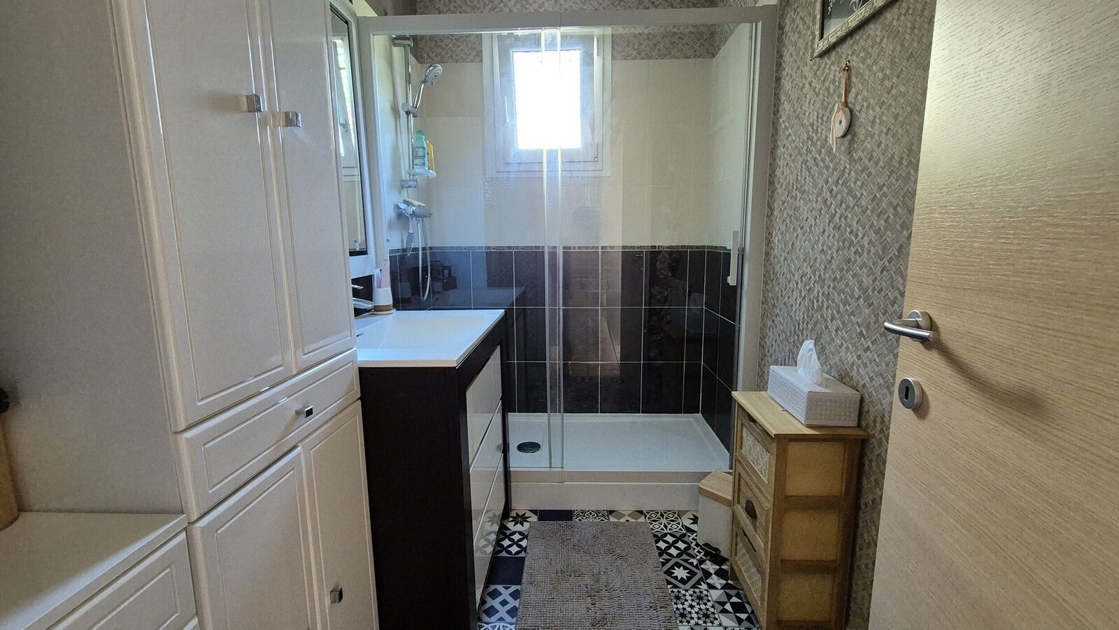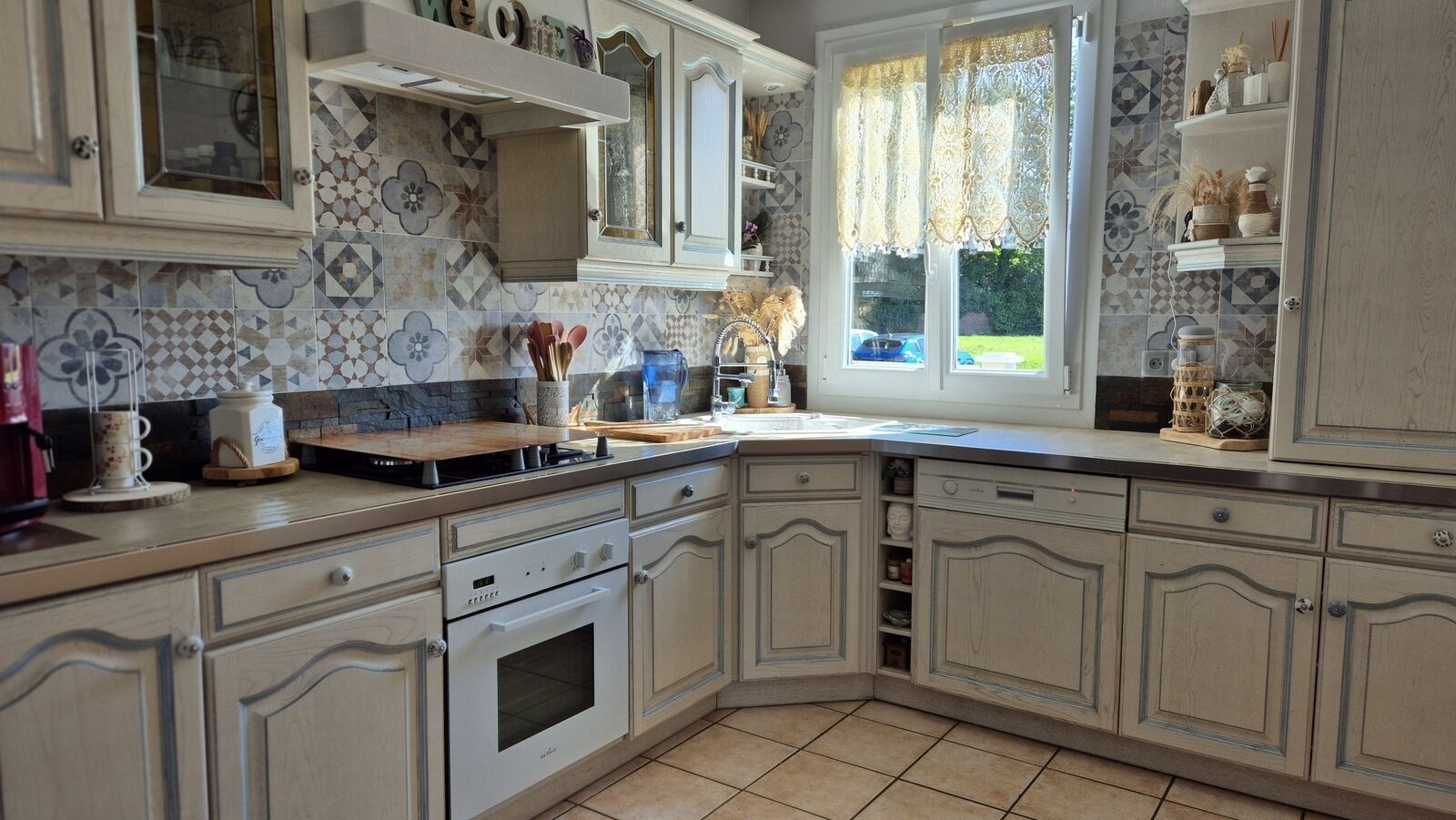 Elle se compose ; d'une entrée avec un w-c séparé, une grande pièce de vie de 32 m² avec 2 portes fenetres donnant sur le jardin, 2 chambres, une salle d'eau, une cuisine ouverte et spacieuse, un garage qu'il est possible de transformer ainsi que les combles aménageables.