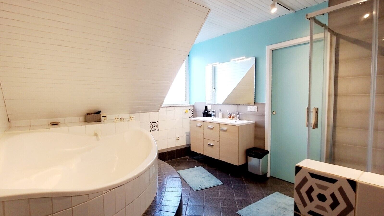 • Une salle de bain bien pensée avec baignoire d’angle, douche, double vasque + coin buanderie