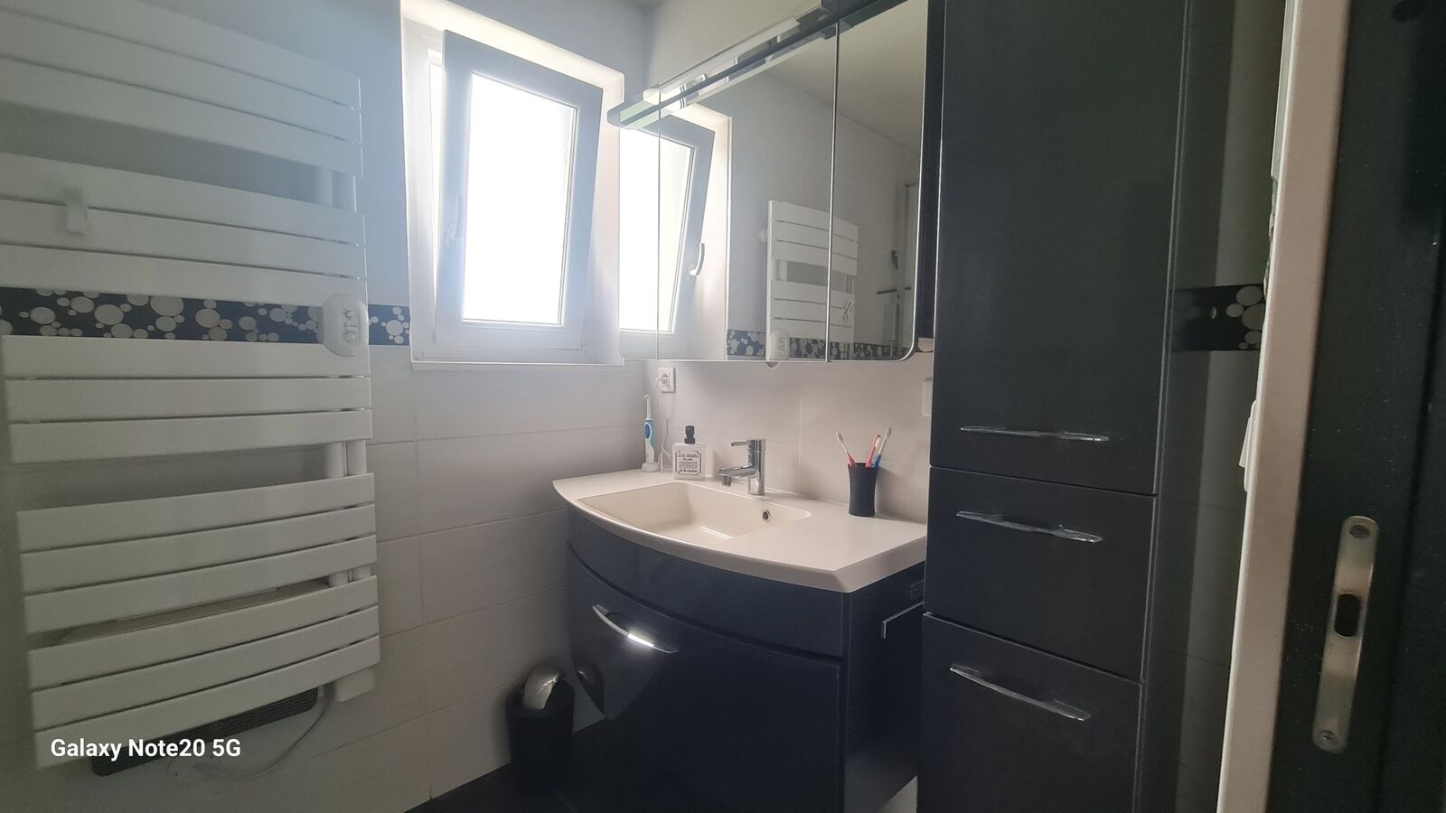 Une salle d'eau avec douche à l'italienne, vasque, colonne de rangement