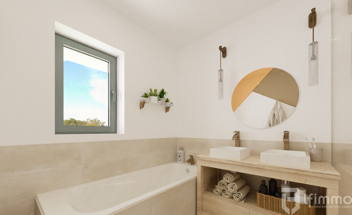 À l’étage, trois chambres de 13 m² avec placards intégrés offrent un espace personnel pour chaque membre de la famille, accompagnées de WC indépendants et d’une salle de bain élégante équipée d’une douche, d’une baignoire et d’une double vasque.