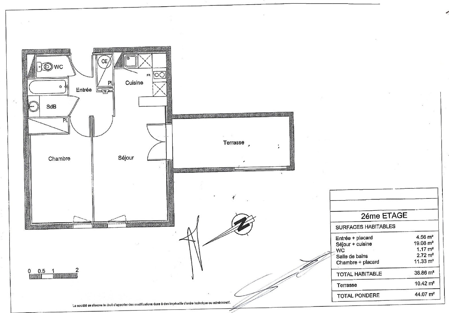 L'appartement est composé d'un hall d'entrée qui dessert un séjour cuisine de 19 m² s'ouvrant sur une terrasse sans vis à vis de 10 m² orientée sud-ouest, une chambre de 11 m² avec placard, d'une salle de bain et d'un wc séparé.