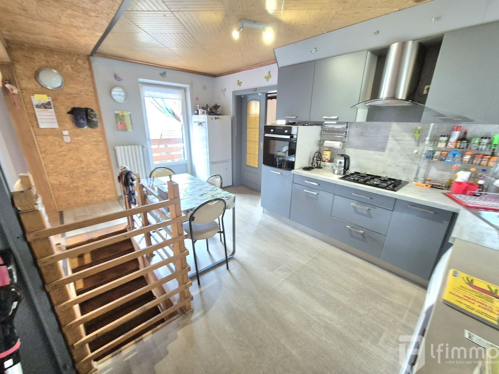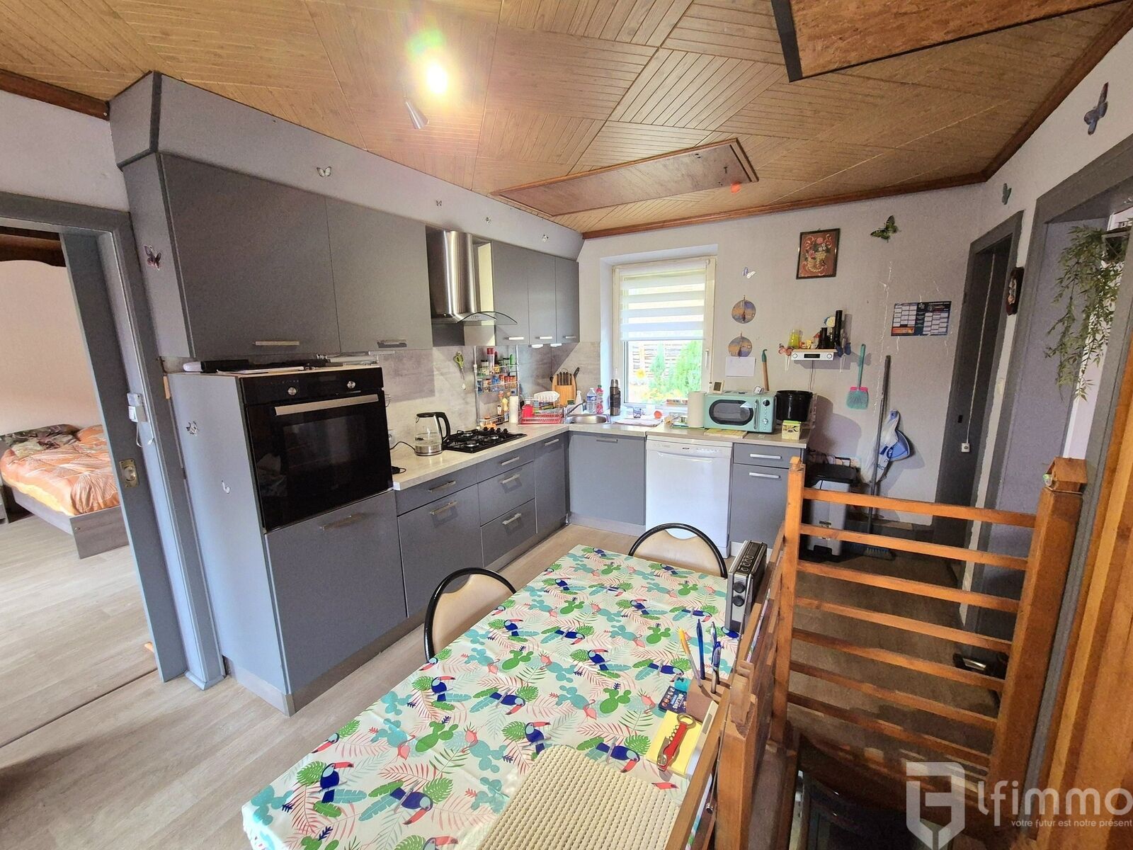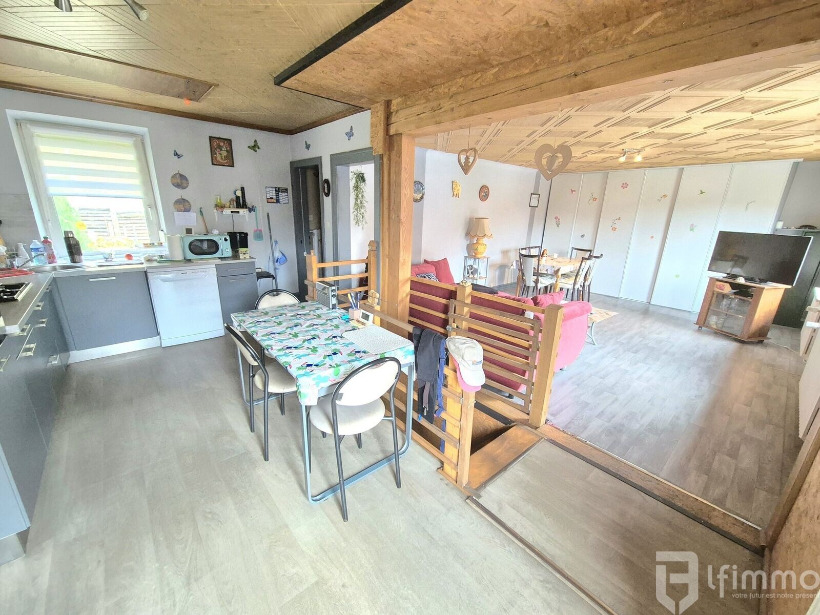 au 1er étage: une salon-séjour de 22.99 m2 ouvert sur une cuisine équipée de 14.44 m2 donnant sur un balcon de 3 m2, une belle chambre de 21.30 m2, une salle d'eau de 6.46 m2, un wc avec lave main de 1.45 m2 et un dégagement de 4.20 m2 donnant sur une terrasse couverte de 20.03 m2.