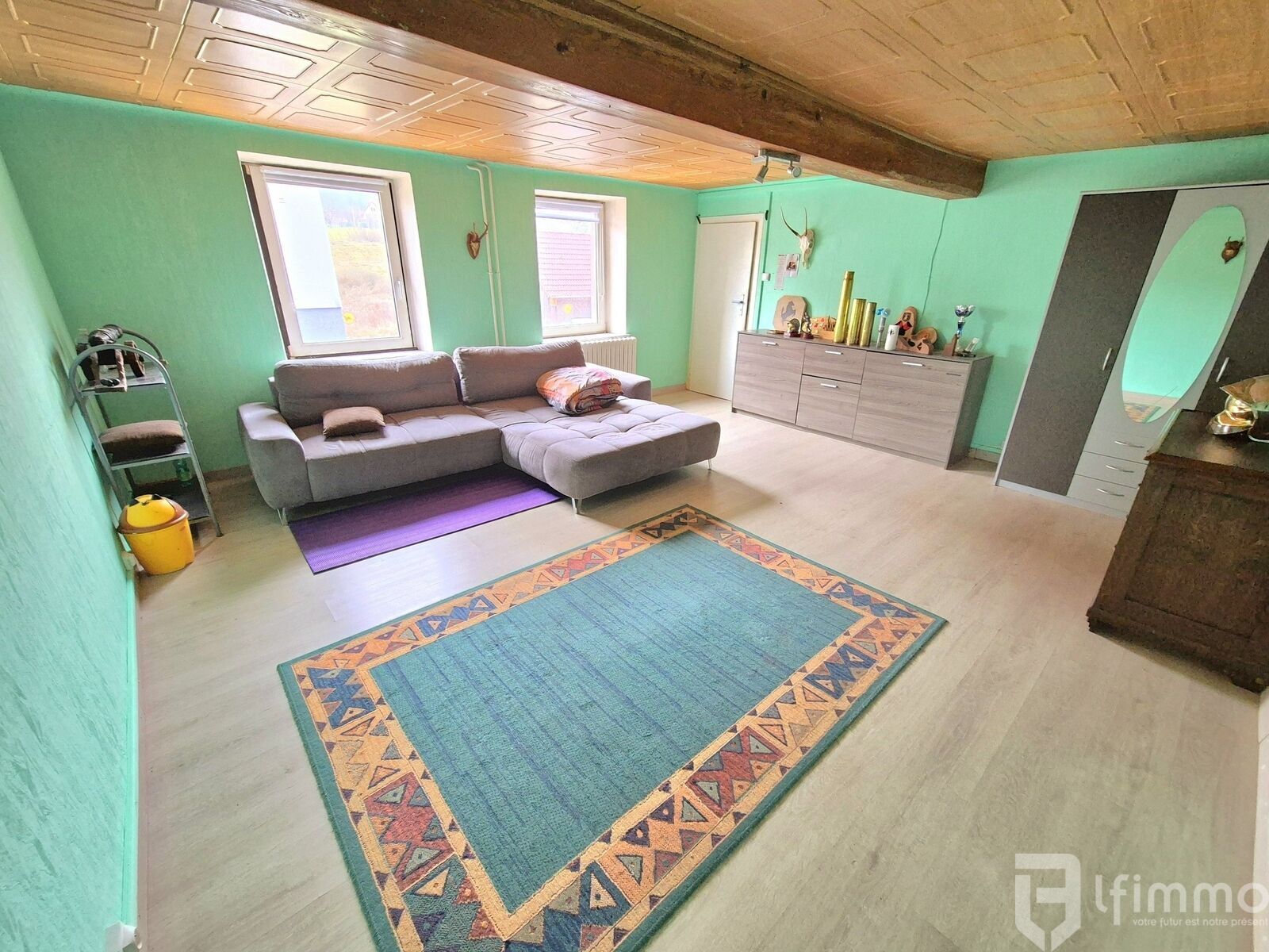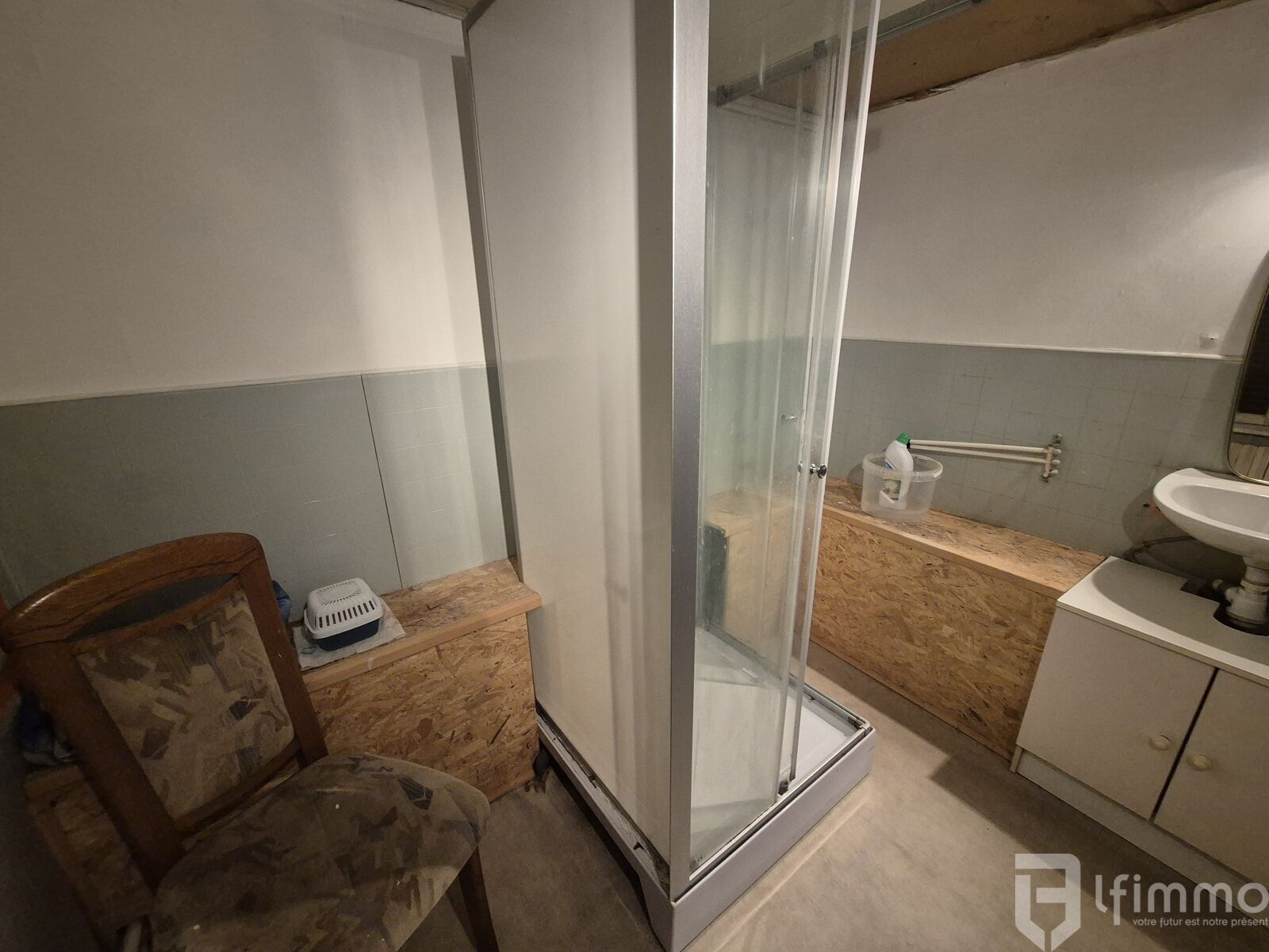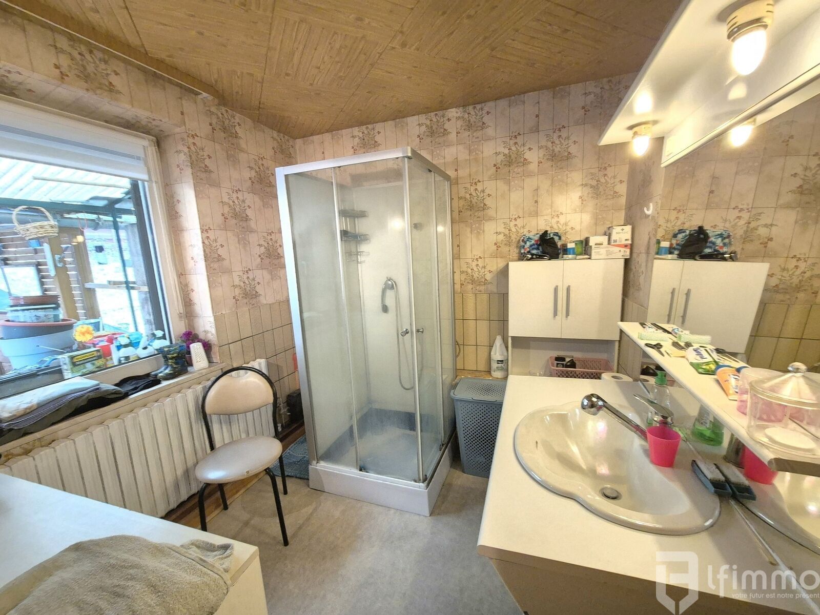 au rdc: une entrée de 5.38 m2, une chambre de 19.80 m2, un dégagement de 7.60 m2 donnant équipé d'un poêle à granules, un salon-séjour de 26.27 m2 pouvant être transformé en chambre, un dégagement de 2.68 m2, un wc de 1.71 m2 et une salle d'eau équipée d'un lavabo et d'une douche de 4.96 m2.