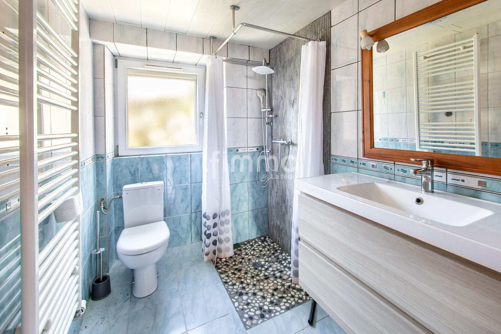 Au rez-de-chaussée, la maison offre trois chambres supplémentaires, une pièce de passage avec cheminée, un petit dégagement, une buanderie-chaufferie, ainsi qu’un garage de 25 m² accessible directement depuis l’intérieur. La cheminée permet de chauffer efficacement les chambres du rez-de-chaussée, en complément du chauffage au gaz.