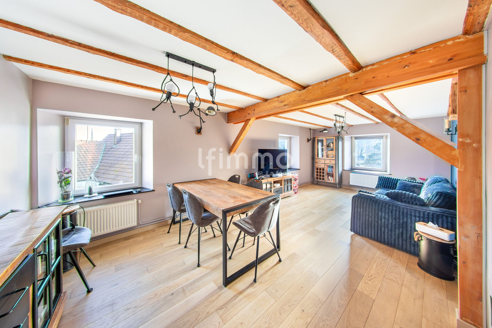 À l’étage, l’espace de vie comprend une cuisine équipée avec un accès direct à une terrasse d’environ 25 m², idéale pour profiter des beaux jours. Le salon-salle à manger, spacieux et lumineux, bénéficie de poutres apparentes, apportant du caractère et du charme à la pièce. Ce niveau comprend également deux chambres et une salle de bain moderne avec baignoire balnéo, douche et WC.