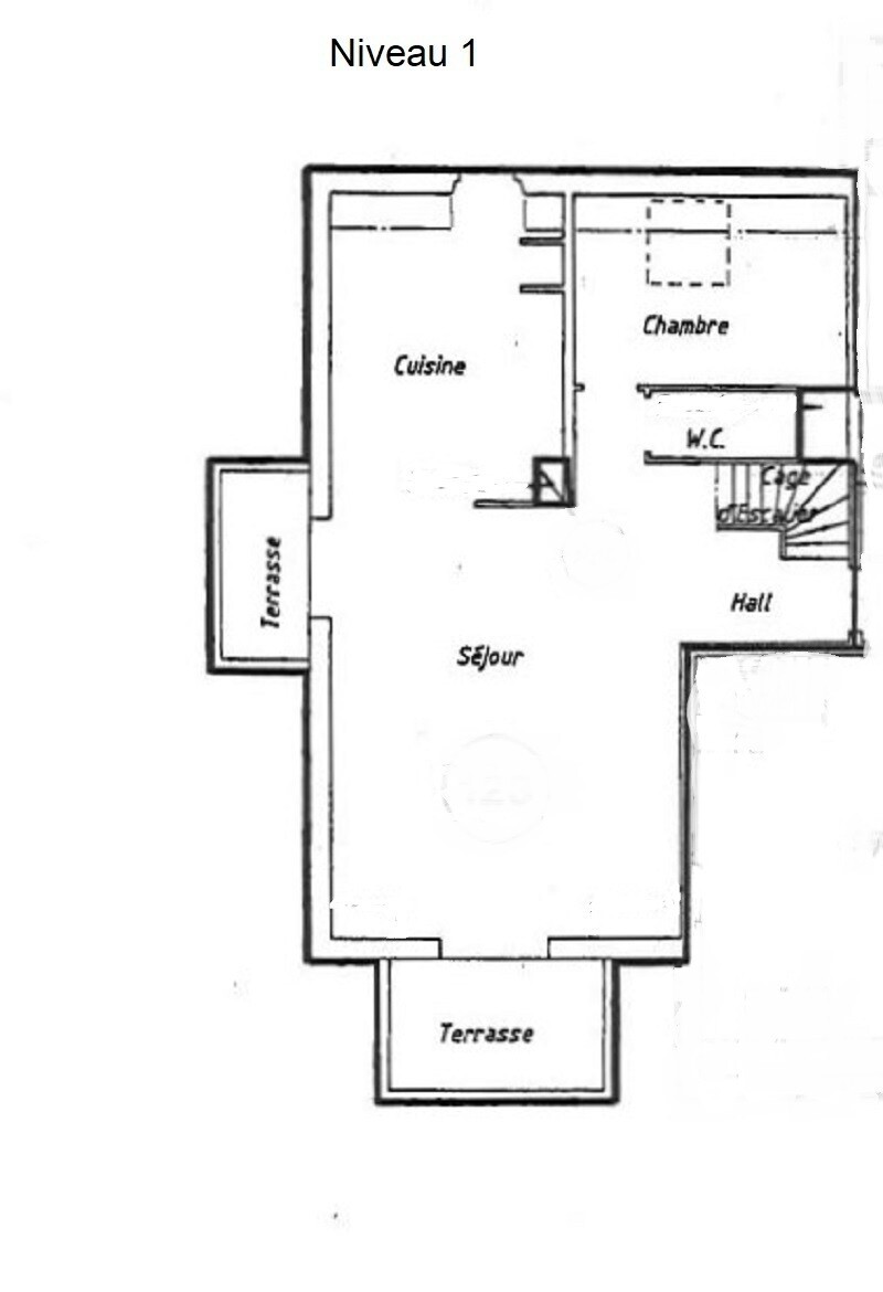 - Au premier niveau : un hall d’entrée desservant une belle pièce de vie de 54 m² avec sa cuisine équipée ouverte sur séjour avec accès à un balcon d’environ 3,5m² et une terrasse de 6m², une 1ère chambre, un WC séparé et l’accès à l’étage.