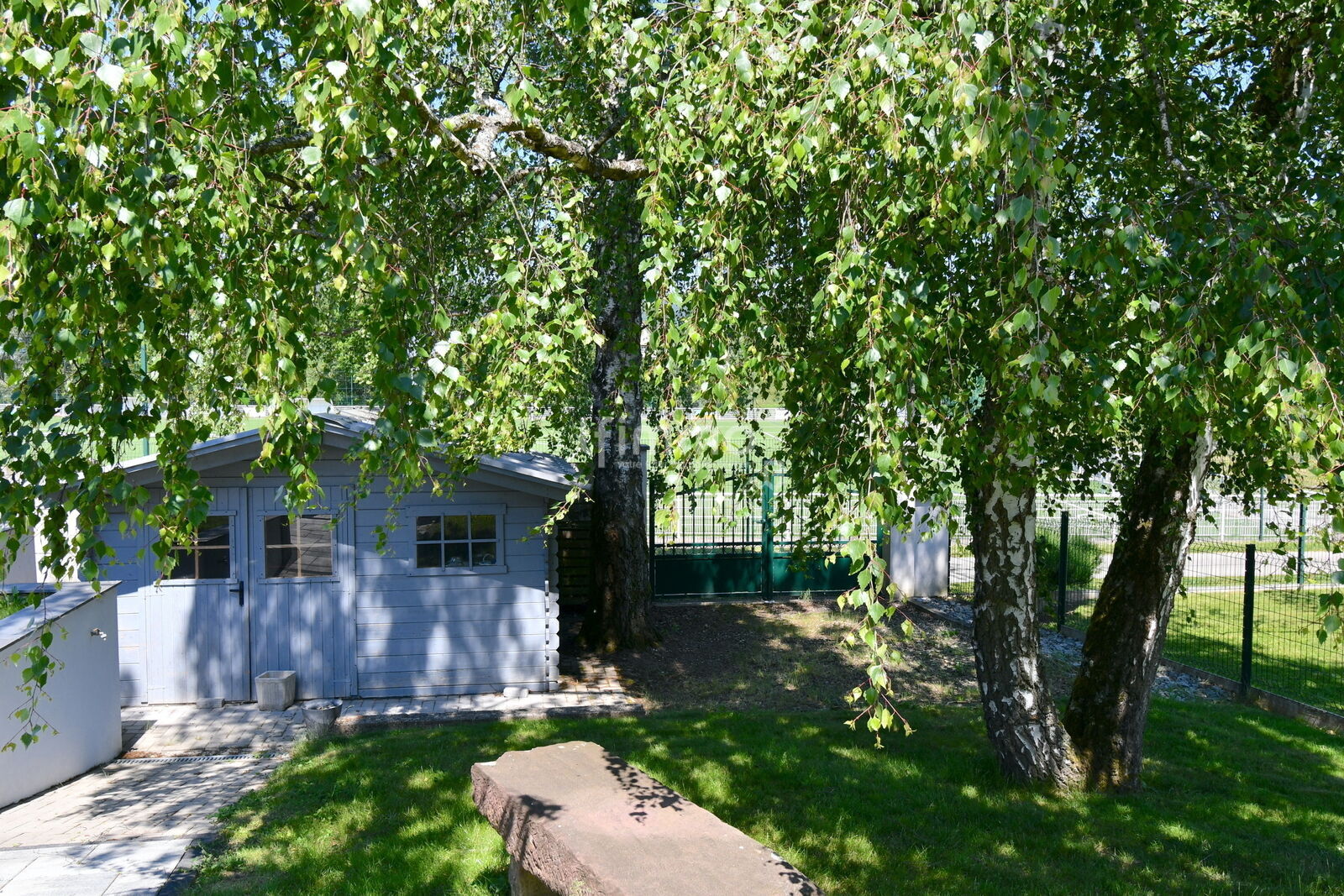 Le terrain arboré et clos de 17 ares situé dans un quartier calme abrite également dans la grande cour une dépendance pour garer deux voitures supplémentaires et stocker diverses marchandises.