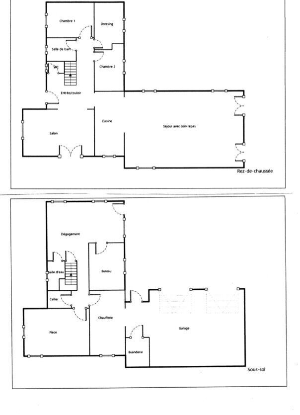 Le sous-sol d´ une surface comparable abrite diverses pièces dont une chaufferie (pompe à chaleur De Dietrich et chaudière au fioul Buderus en relai qui alimentent le chauffage au sol et les radiateurs dans les chambres), une salle d´eau avec toilettes ainsi qu ´un garage pour deux voitures.