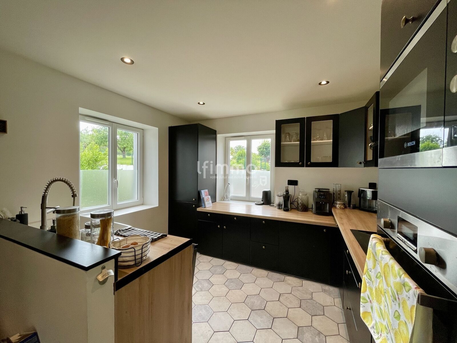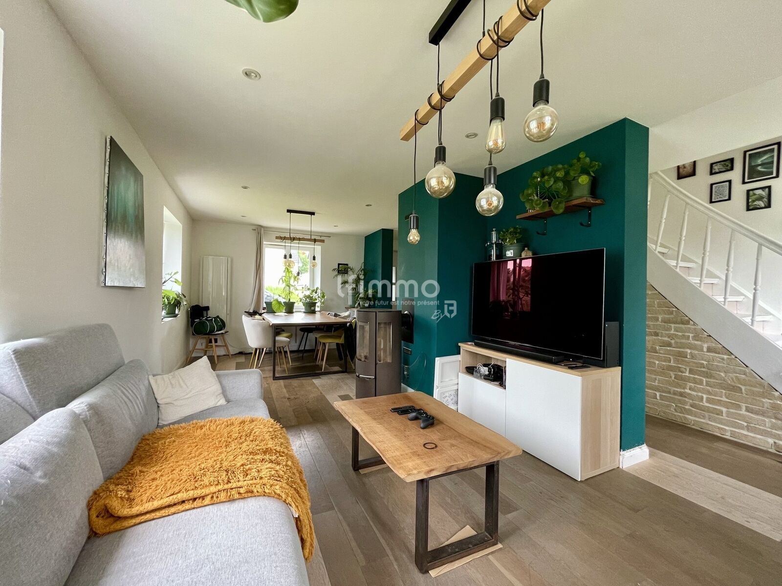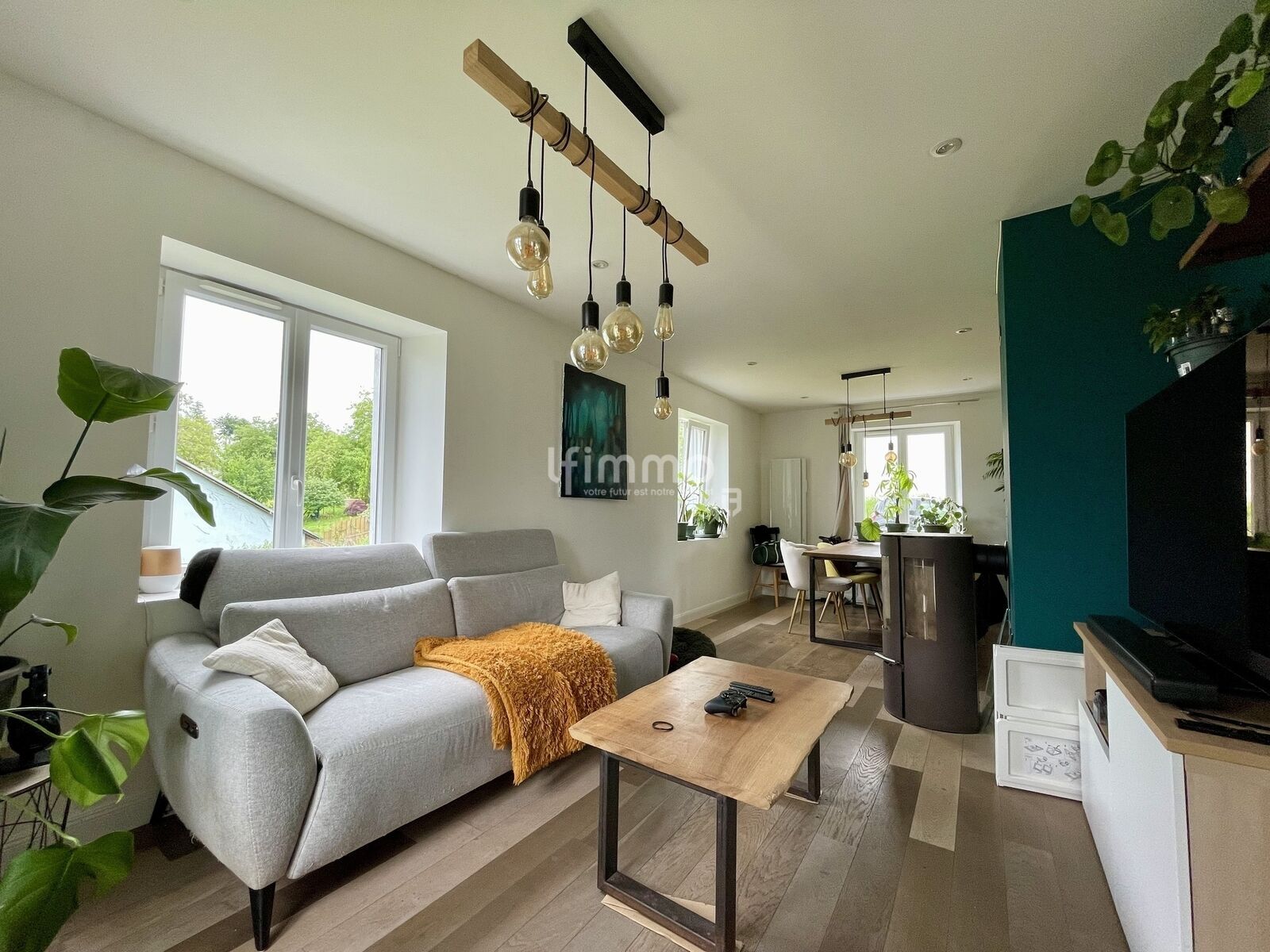 Elle vous propose une chaleureuse pièce de vie, grâce au poêle à pellets, et lumineuse grâce à ses nombreuses ouvertures.