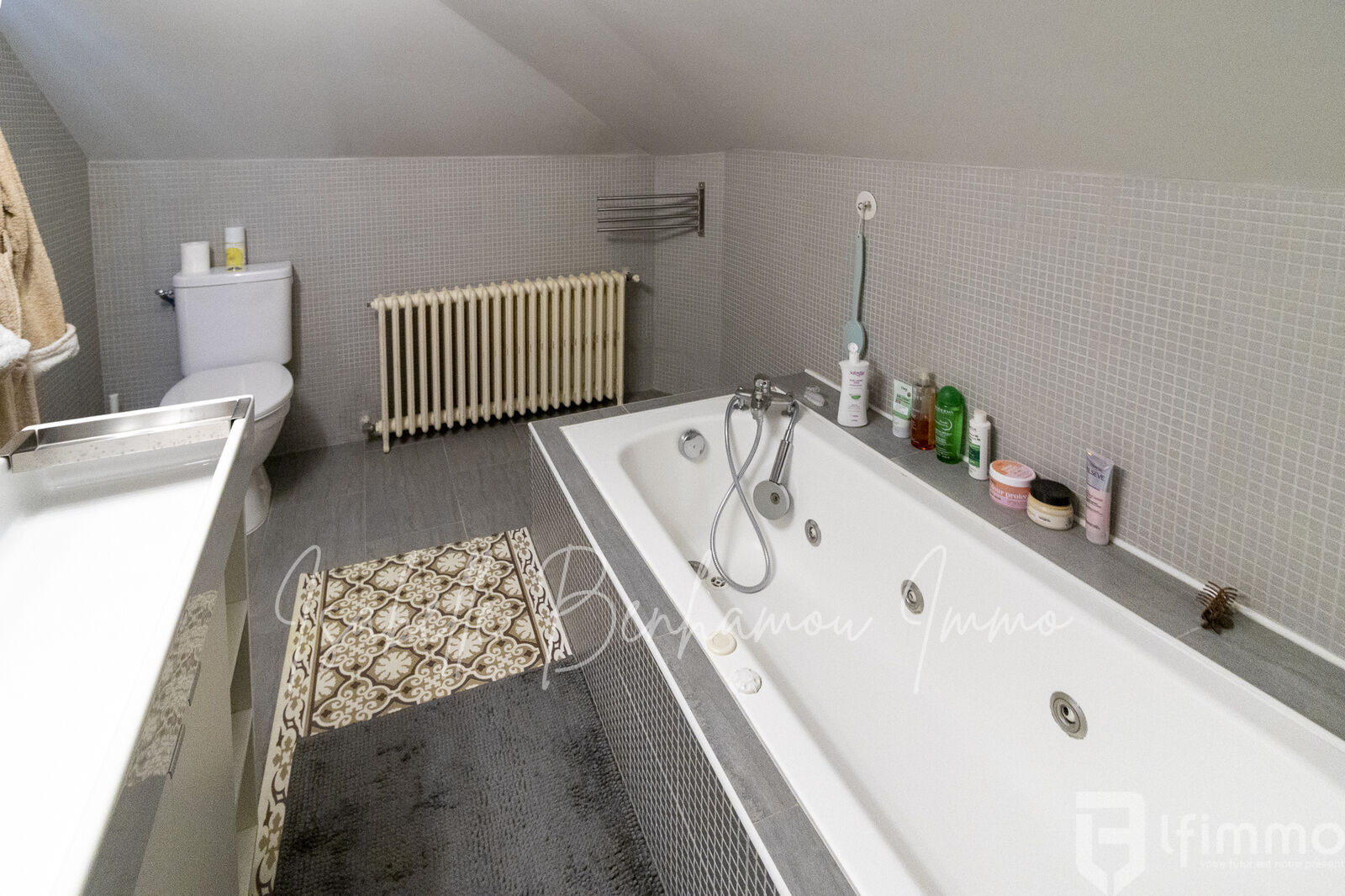 A l'étage, un palier dessert deux grandes chambres avec une belle hauteur sous plafond et placards/penderie, une salle de bain et des toilettes indépendants.