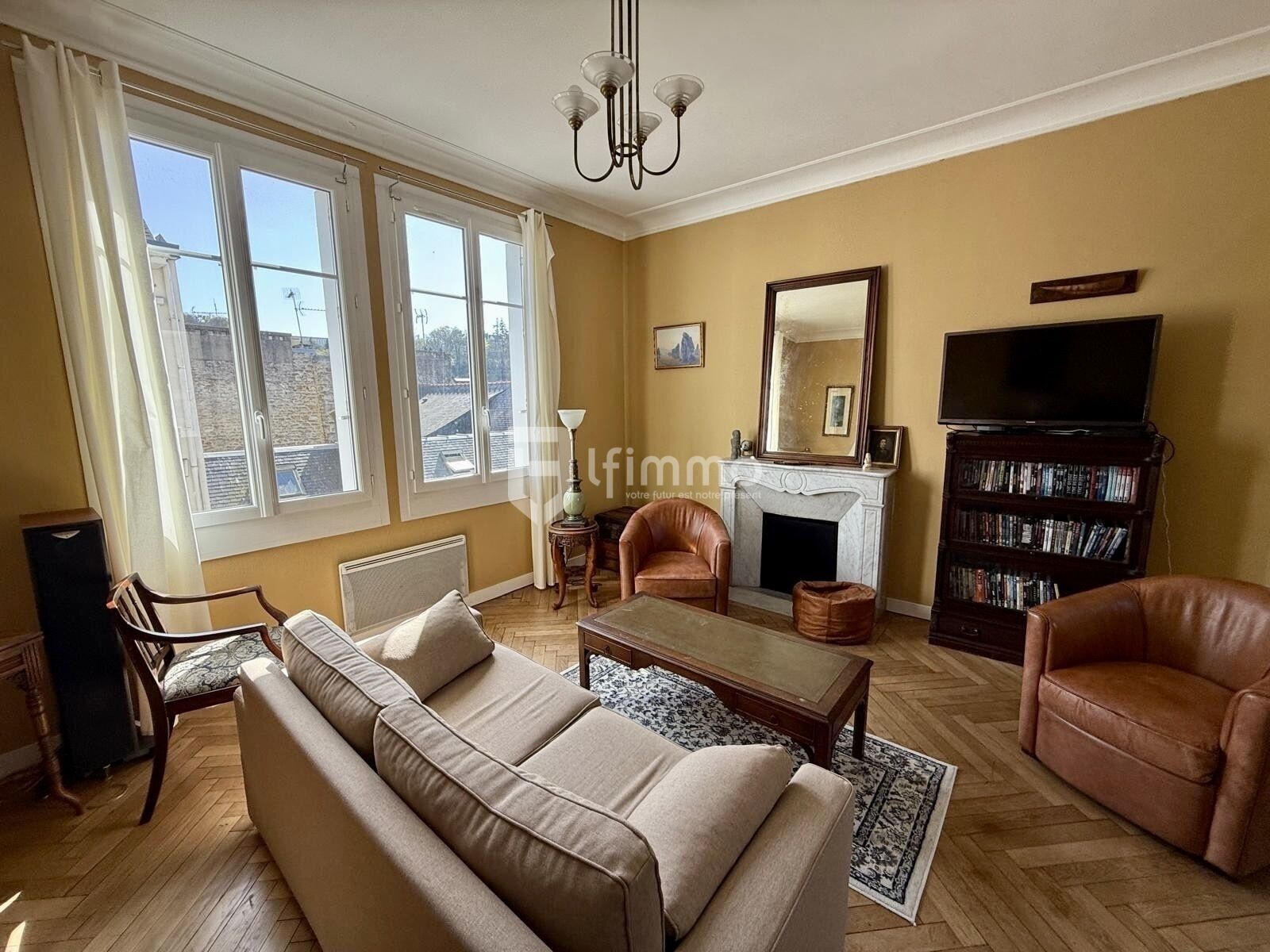 Dès l’entrée, vous serez séduit par la hauteur sous plafond, ses vastes volumes, ainsi que le parquet en chevron, élégant et raffiné. Le vaste salon traversant, baigné de lumière grâce à ses grandes fenêtres, s’ouvre sur une cuisine fonctionnelle, créant ainsi une belle pièce de vie. Une cheminée en marbre ancien, blanc et gris, ajoute une touche de sophistication à l’ensemble.