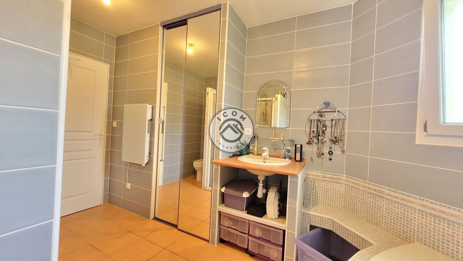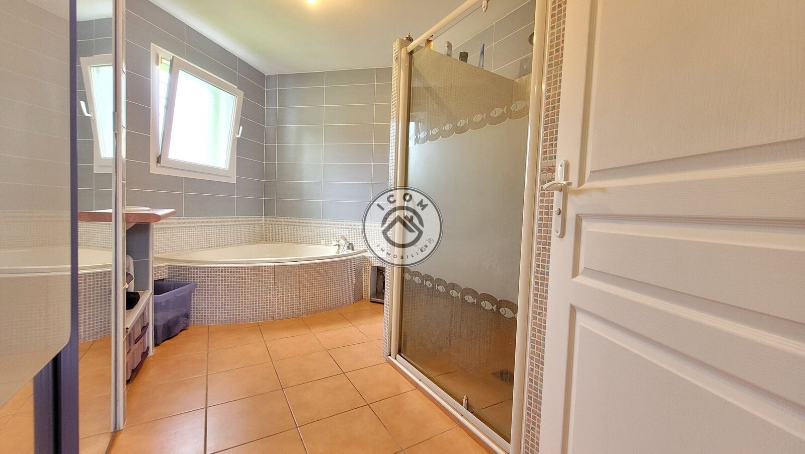 Une salle de bain complète : baignoire d’angle, douche à l’italienne (1x1 m), double vasque et WC.