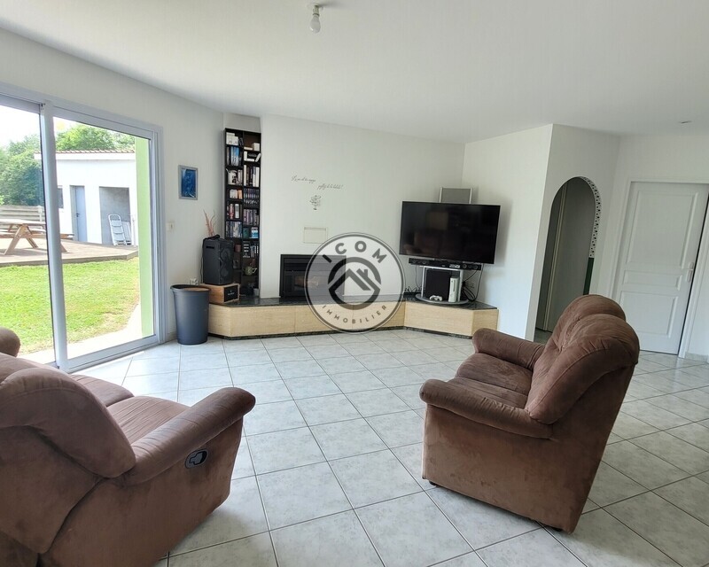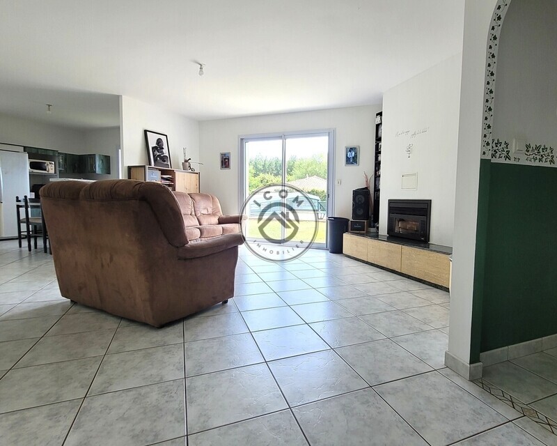 Un vaste séjour lumineux de 35 m², baigné de lumière grâce à ses grandes baies vitrées, équipé d’un insert à pellets avec récupérateur de chaleur et d’une climatisation réversible connectée.