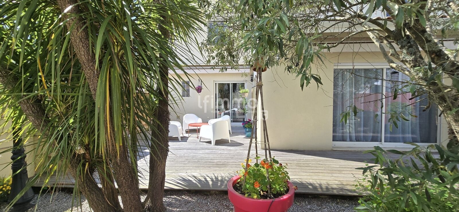 Côté extérieur, le jardin arboré et fleuri constitue un véritable havre de paix. Sans vis-à-vis, la terrasse en bois vous invite à la détente ou à partager des repas en famille ou entre amis.