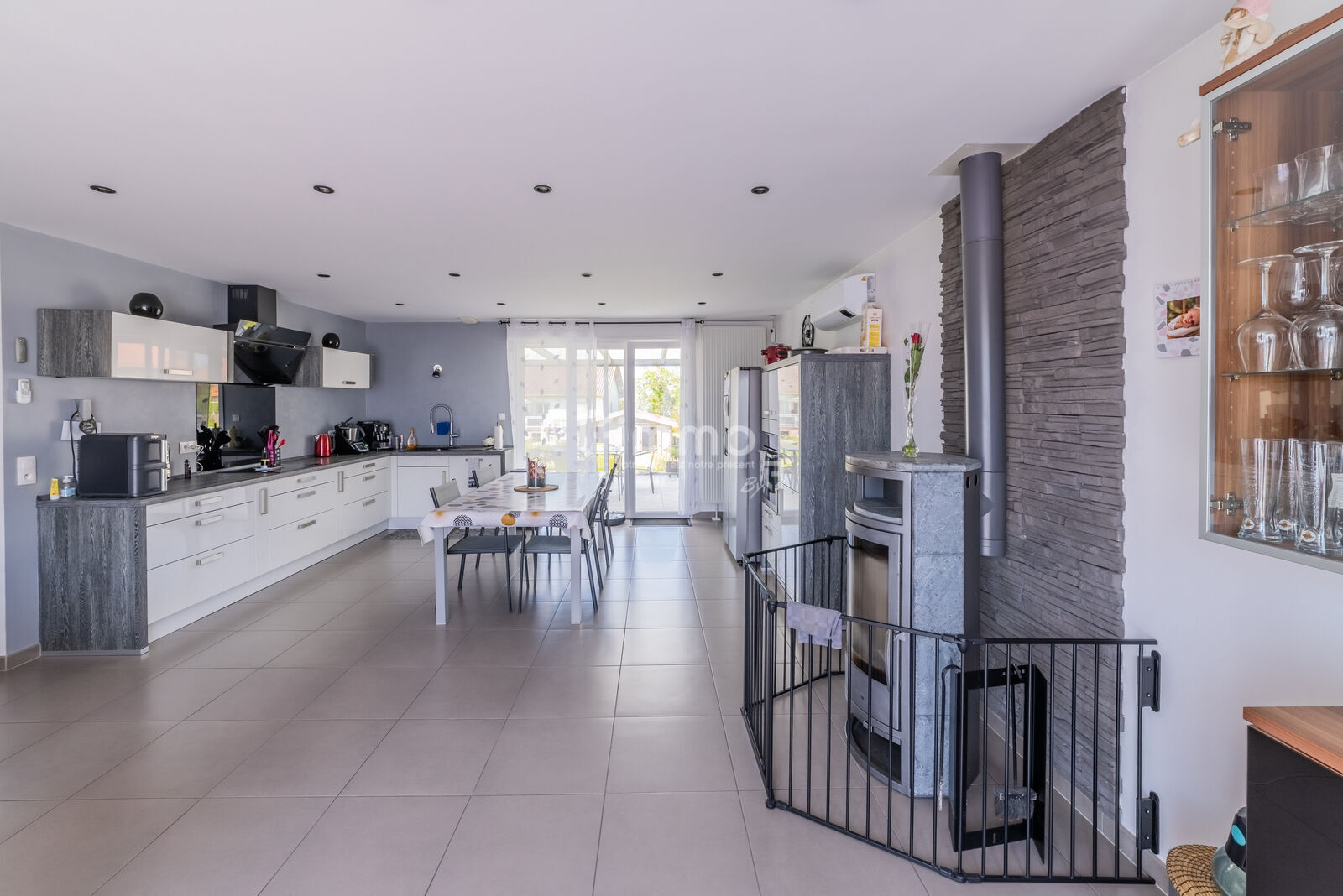 La cuisine, aménagée à l'américaine, vers le salon/séjour, lui-même bien orienté, vous permettra de profiter de belles lumières naturelles tout au long de la journée, créant une atmosphère accueillante pour vos moments en famille ou entre amis, tout cela proche d'un joli poêle à bois. (Plusieurs modes de chauffage sont existants).