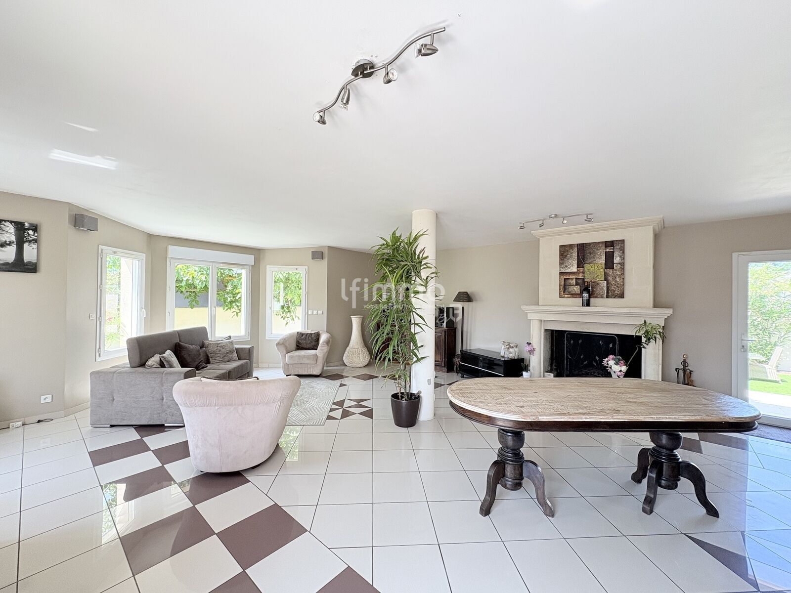 Une vaste pièce de vie lumineuse, agrémentée d'une cheminée conviviale