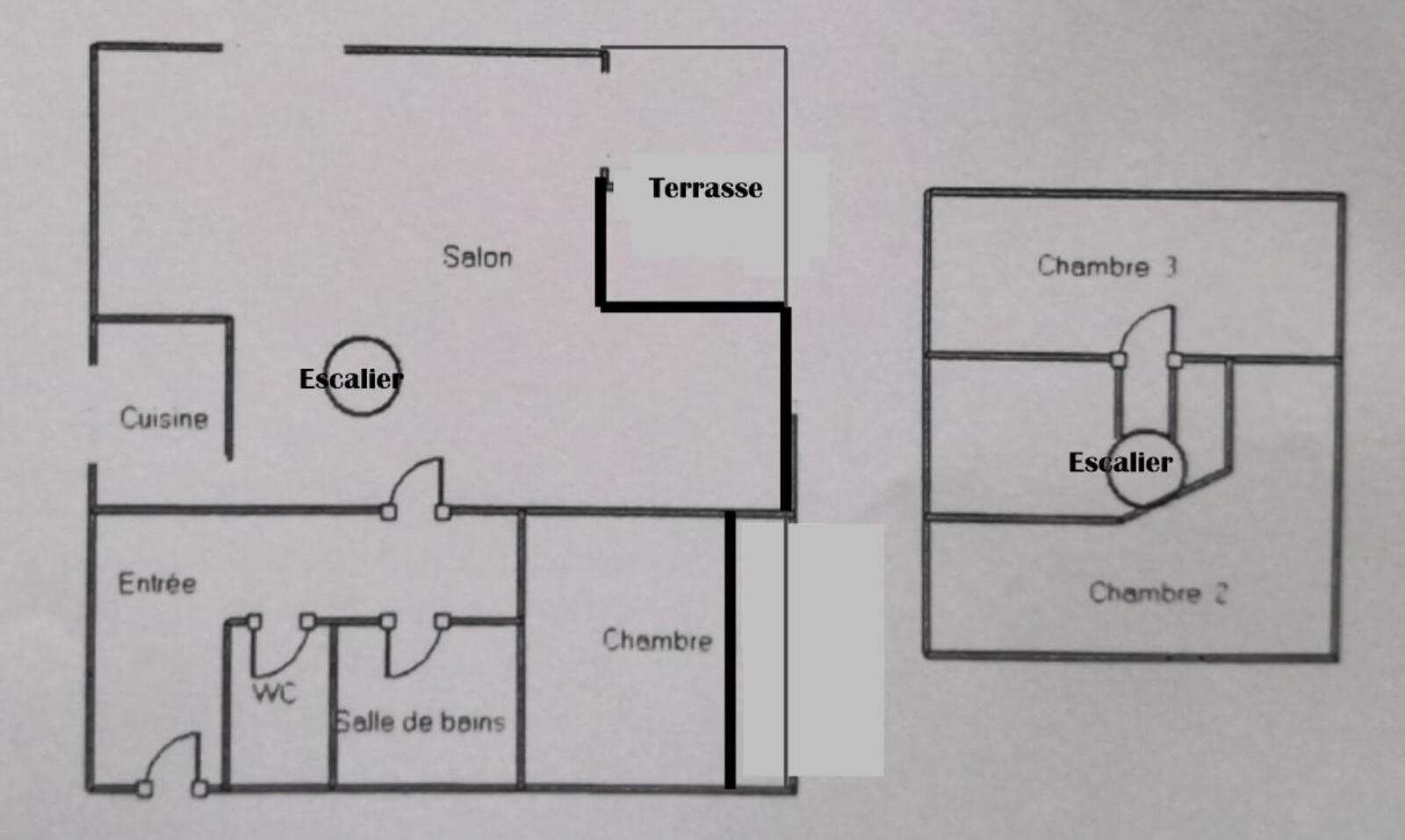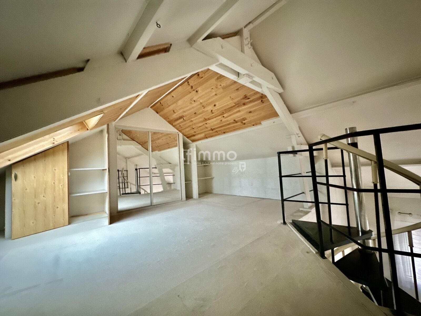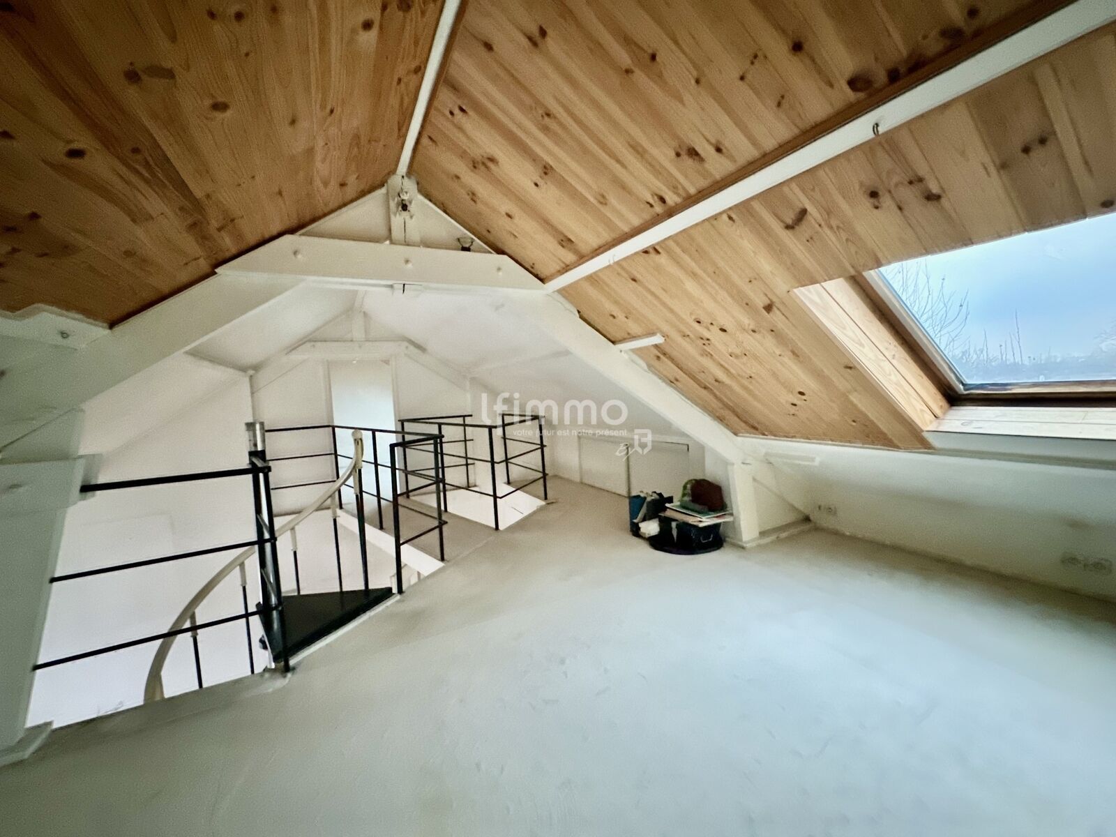 A l'étage: Une Chambre de 18 m2 au sol et un Espace détente/bureau de 18m2 (3ème chambre d'origine). Multiples rangements en sous-pentes.