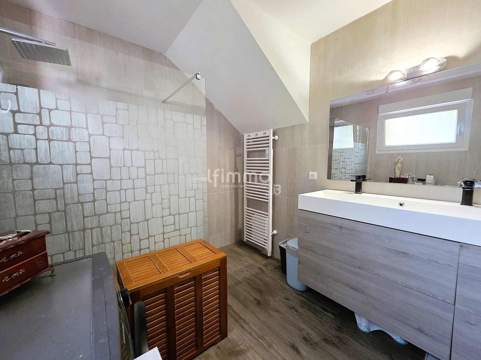 * un couloir desservant trois chambres, une salle d’eau moderne (grande douche + double vasque) et un WC suspendu indépendant,