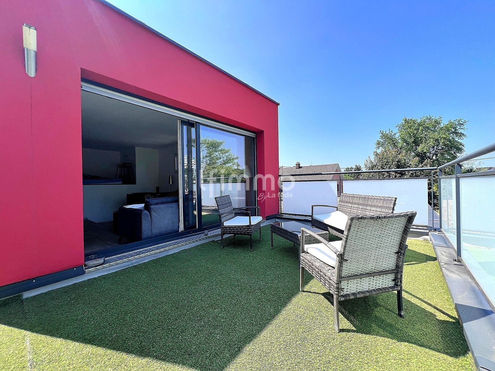 * un salon légèrement en contre-haut avec espace mezzanine et accès à une belle terrasse exposée avec vue dégagée,